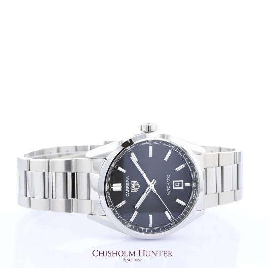 Discover the new Carrera models at Chisholm Hunter. The TAG Heuer Carrera 39mm Mens Watch WBN2110.BA0639 features the newly refined lugs and bracelet designed for the ultimate comfort on the wearer’s wrist. The sleek blue-black sunray dial holds rhodium-plated features and a date window at 6 o’clock. This model is powered by the impressive Calibre 5 automatic movement with 38-hour power reserve.