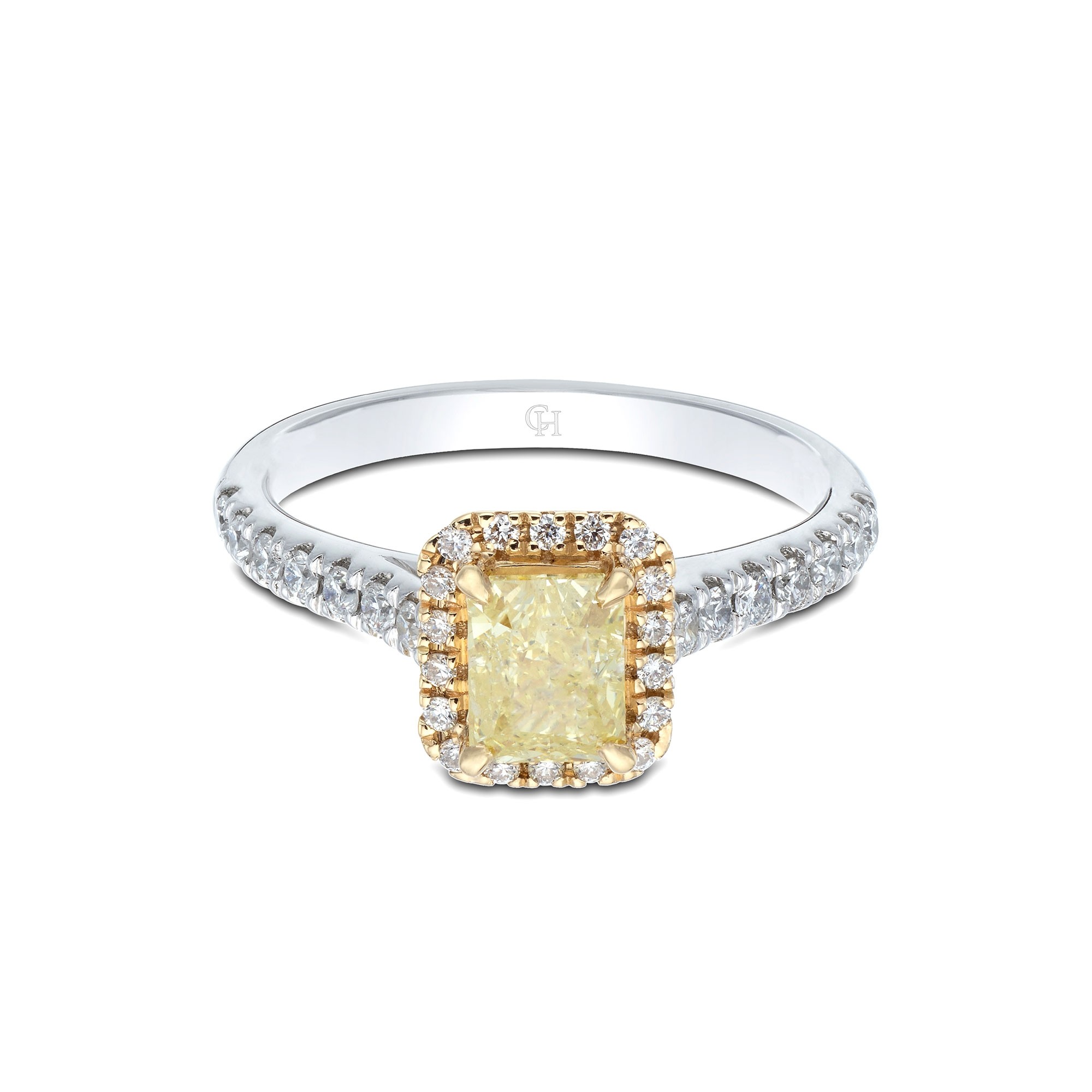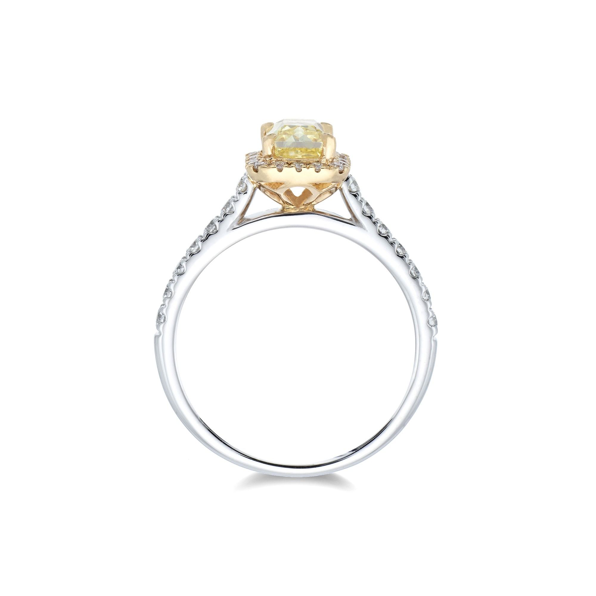 18ct Two colour gold ring with a certificated yellow cushion cut diamond held in a 4 claw setting with round brilliant and baguette cut diamond shoulders. Approximately 1.20ct total weight.