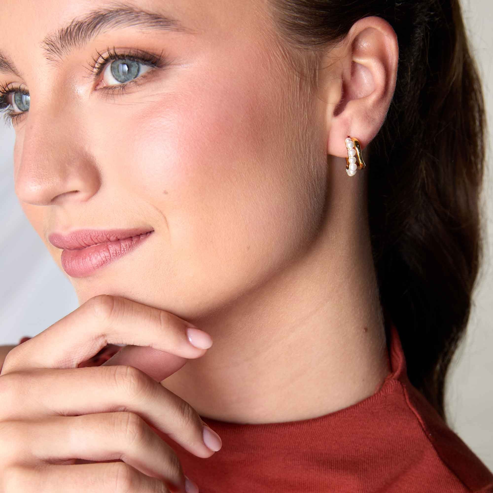 Introducing the 18ct Yellow Gold Vermeil Double Row Pearl Hoop Earrings. Crafted with a durable 3-micron plating layered over 925 sterling silver, these earrings offer a luxurious option for any jewellery collection. The elegant double row design features lustrous pearls.