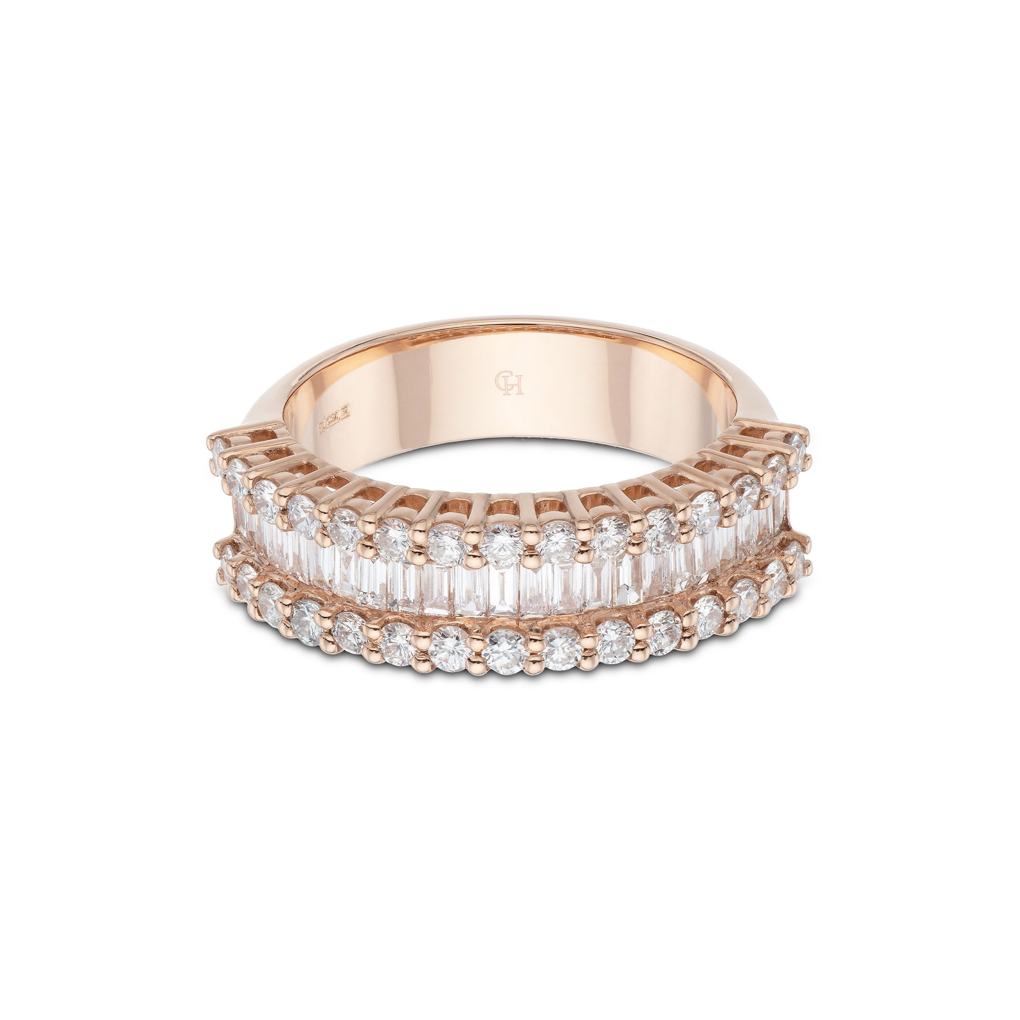 Add sparkle to your look with this stunning 18ct Rose Gold Brilliant and Baguette Cut 1.10ct Diamond Fancy Band from Chisholm Hunter. The silky 18ct rose gold band has been expertly crafted and the striking baguette cut diamonds have been hand-selected by the specialist gemologists at Chisholm Hunter. This piece will catch the light from every angle.