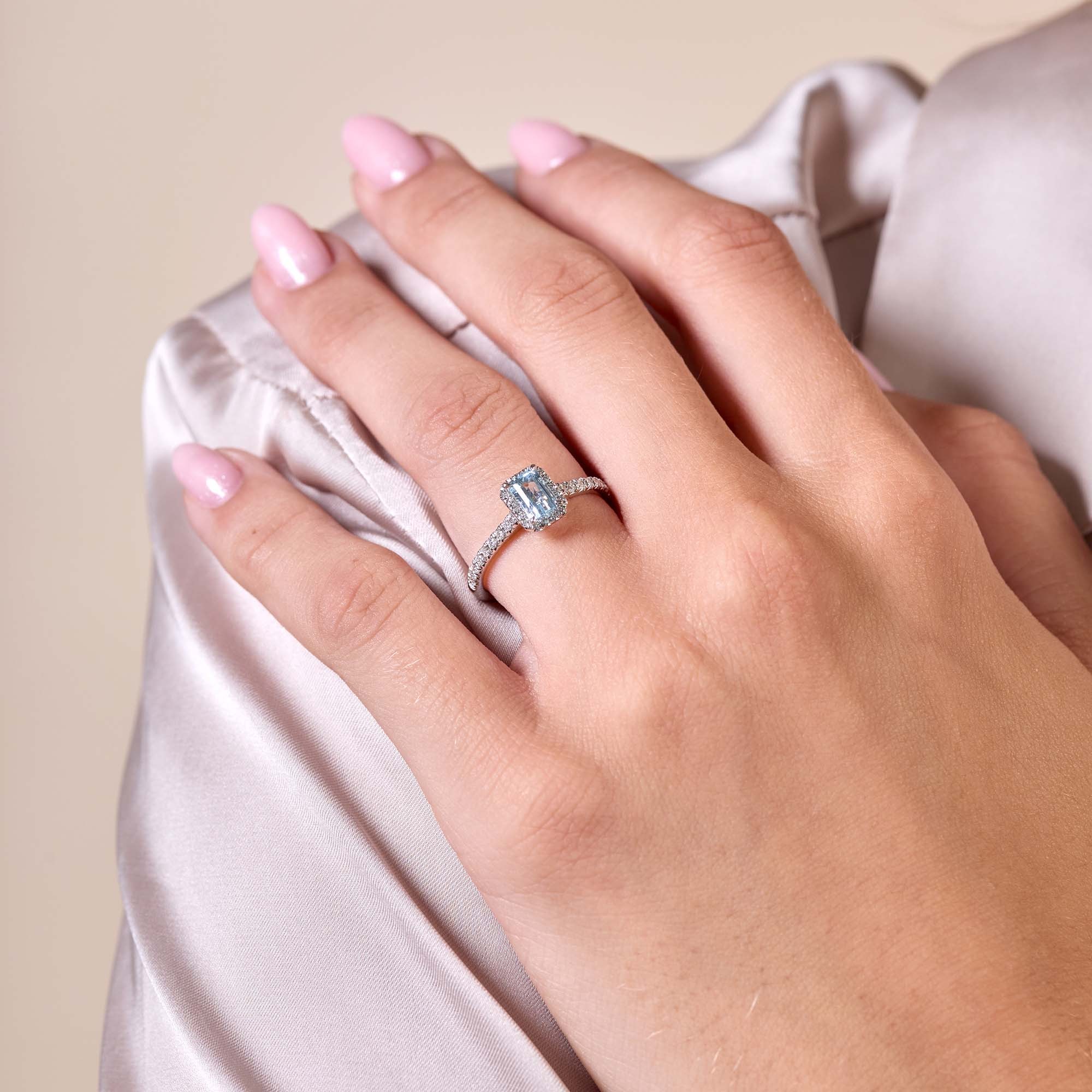 The 9ct White Gold 0.75ct Emerald Aquamarine & Diamond Halo Ring encapsulates luxury in its purest form. It’s not just a piece of jewellery; it’s an epitome of love, a celebration of elegance, and a symbol of timeless devotion. Gift her this extraordinary ring and let each glance at her finger be a reminder of your everlasting love.