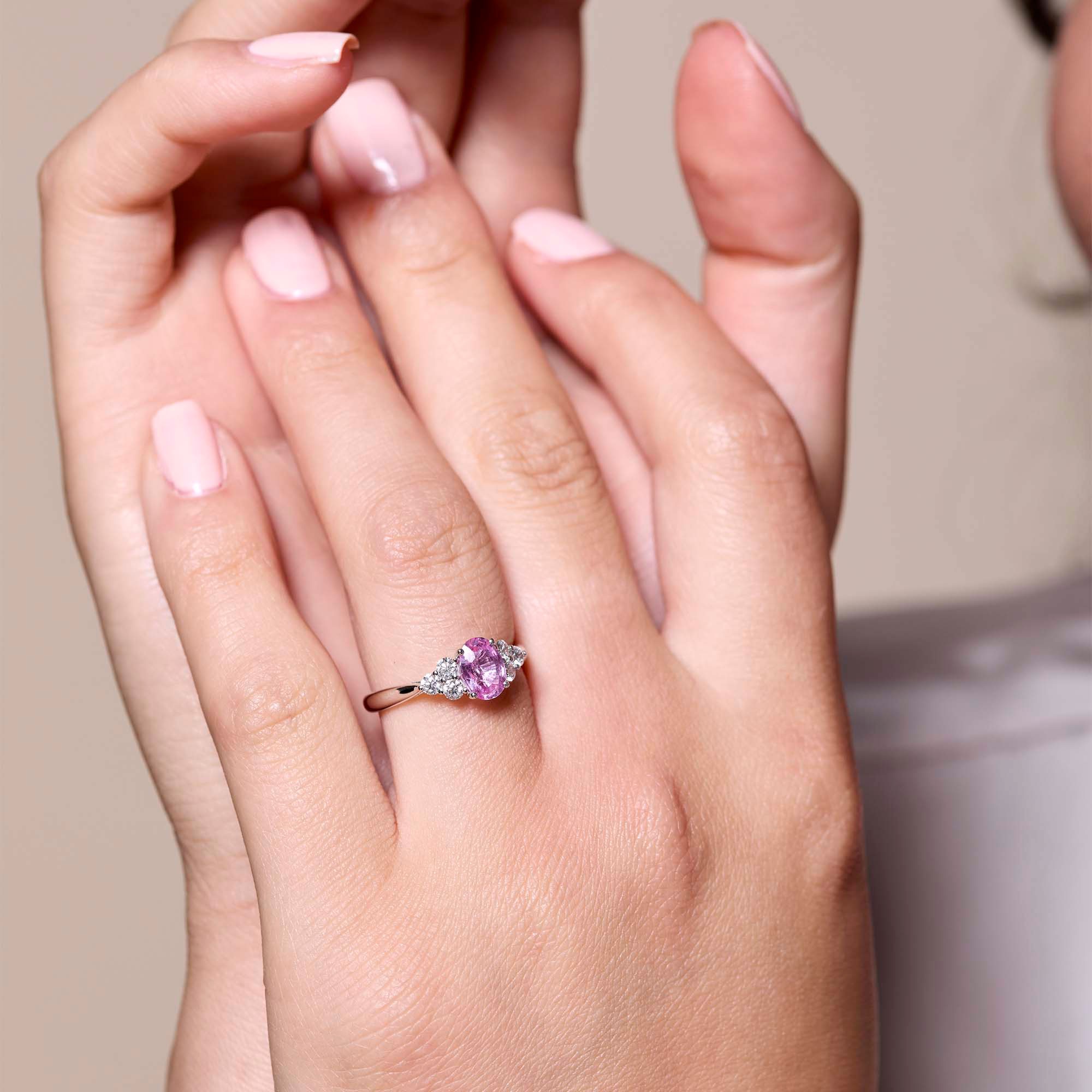 Ideal for those with a discerning eye for quality, the 18ct White Gold 0.88ct Oval Cut Pink Sapphire and 0.30ct Diamond Cluster Ring is more than just a piece of jewellery; it is a testament to meticulous craftsmanship and unmatched elegance. This ring ensures that every glance at her hand is met with awe and admiration.