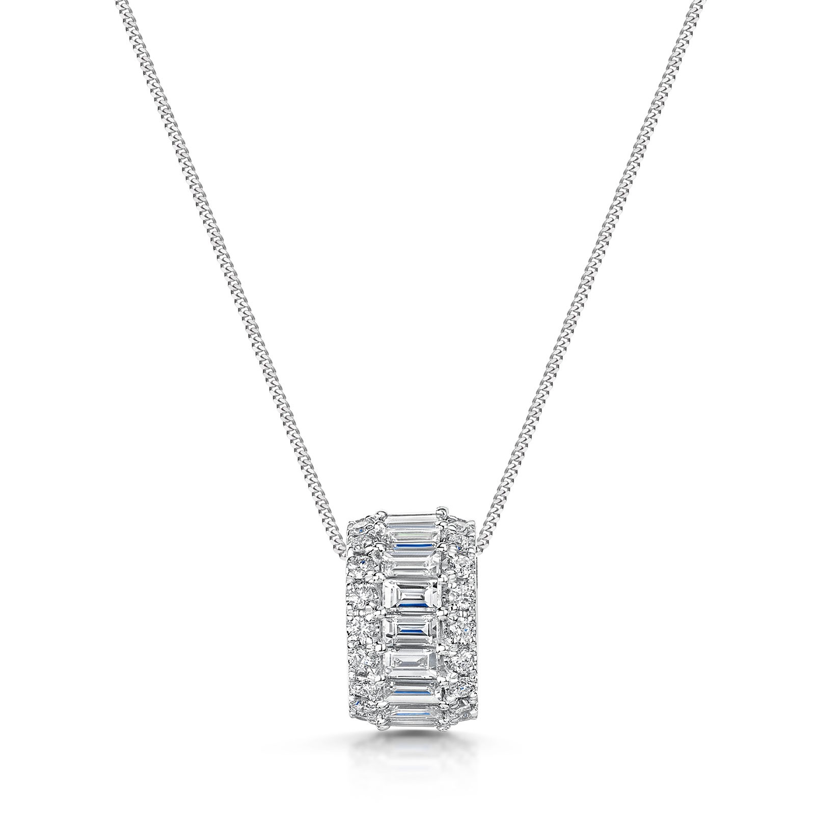 In harmonious beauty, these round brilliant and baguette cut stones give the perfect texture of sparkle on a beautiful 18ct white gold setting and chain. With a total of 1.20ct diamonds, this pendant is sure to make the best statement with any outfit.