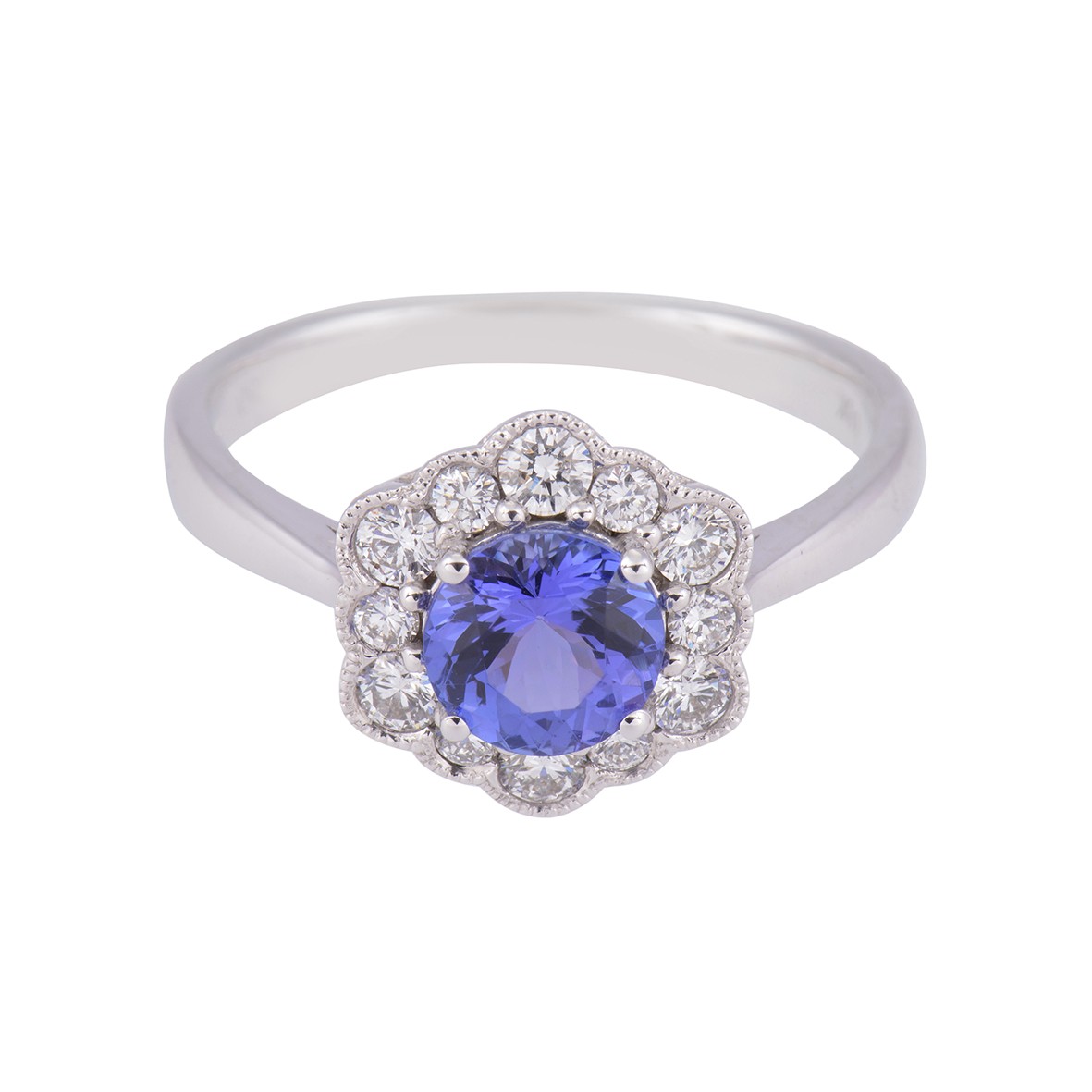 18ct white gold 6mm round brilliant tanzanite and 0.40ct round brilliant diamond cluster