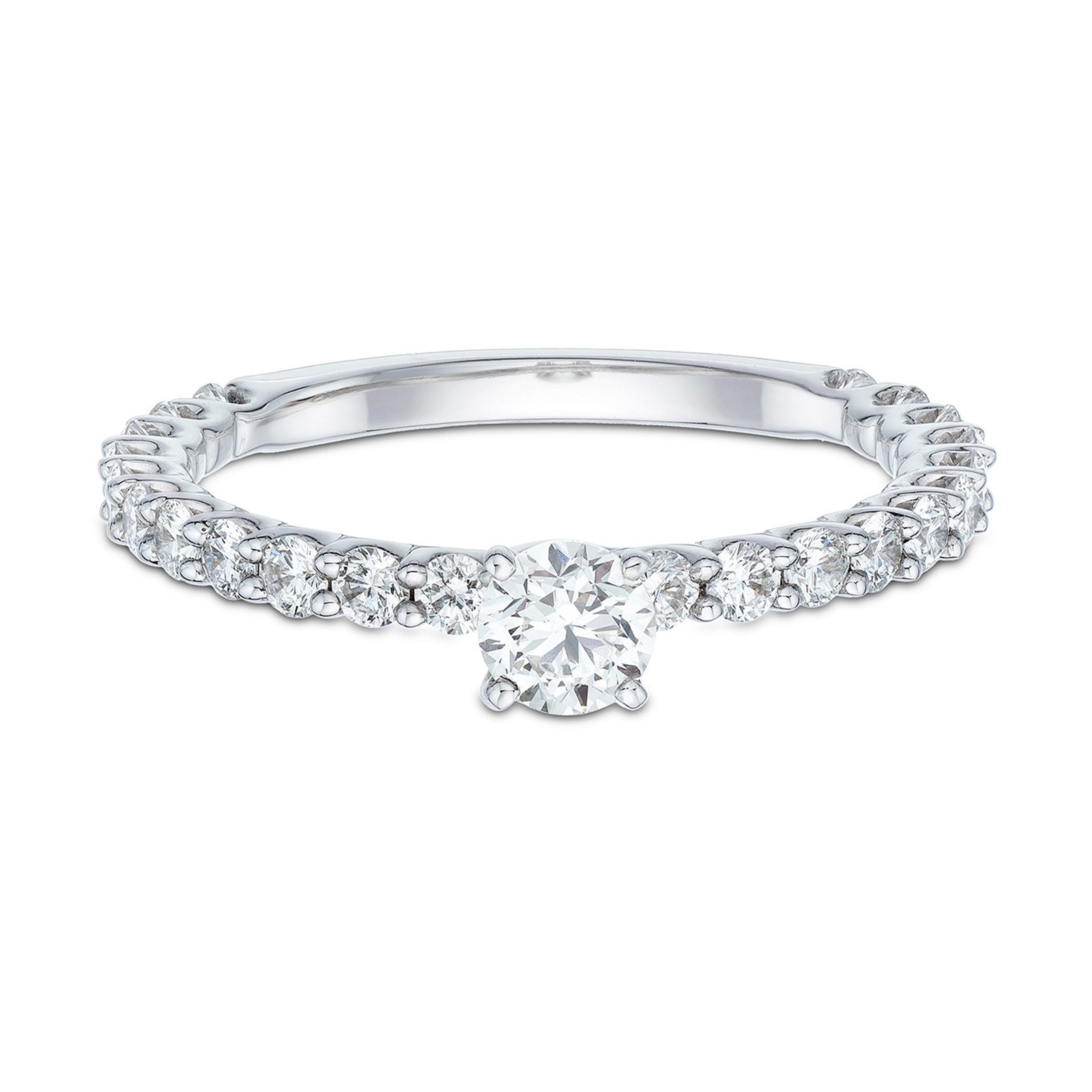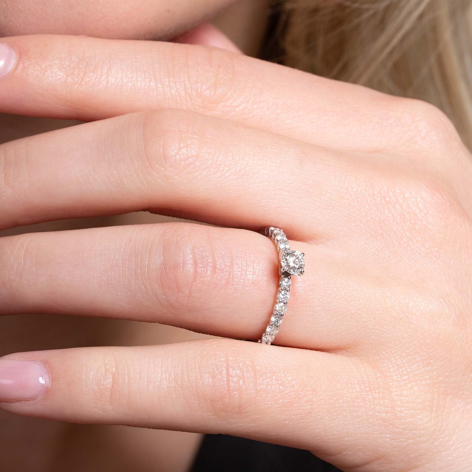 With beautifully clean lines this classic 0.33ct round brilliant diamond solitaire is exquisitely elevated with alluring open diamond shoulders set to allow for maximum light to illuminate your diamonds from every angle. Expertly designed in 18ct while gold, the 3/4 diamond set shoulders wrap around your finger for a dazzling display and maximum comfort with a total diamond weight of 1.00ct.