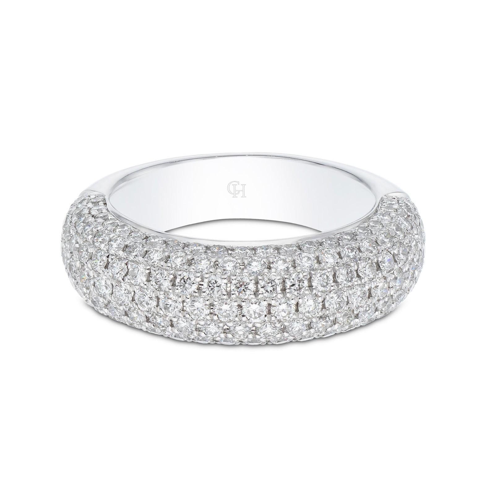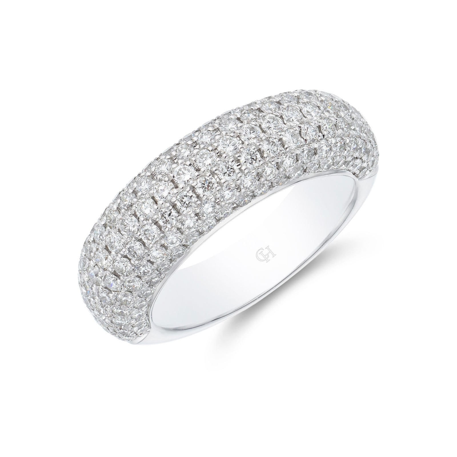 Crafted from luxe 18ct white gold, treat yourself or a loved one to our fancy band ring. Embellished with pave set round brilliant cut diamonds with a total carat weight of 1.44, this glittering statement diamond ring will add some sparkle to your everyday looks. Diamond Information: Cut - Round Brilliant, Colour - G-H, Clarity - SI, Carat Weight - 1.44ct.
