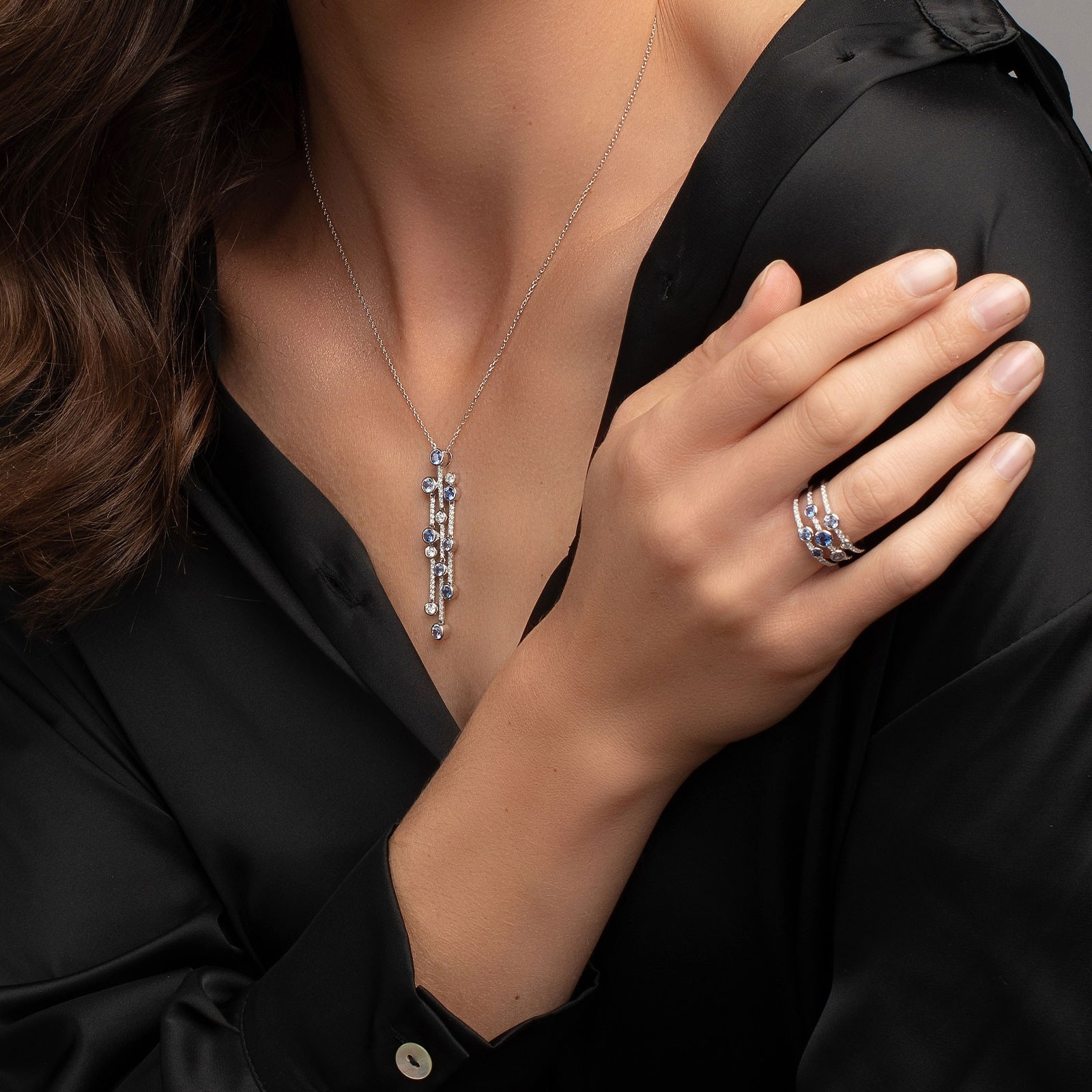 Add a touch of opulence to your special occasion with this 18ct White Gold Brilliant Diamond 0.70ct and Sapphire 1.48ct Rub Over Pendant from Chisholm Hunter. Dropped from 18ct white gold, diamond and sapphire stones in a rub over setting move elegantly with the wearer’s movement. Pair this piece with the matching earrings to complete your look.