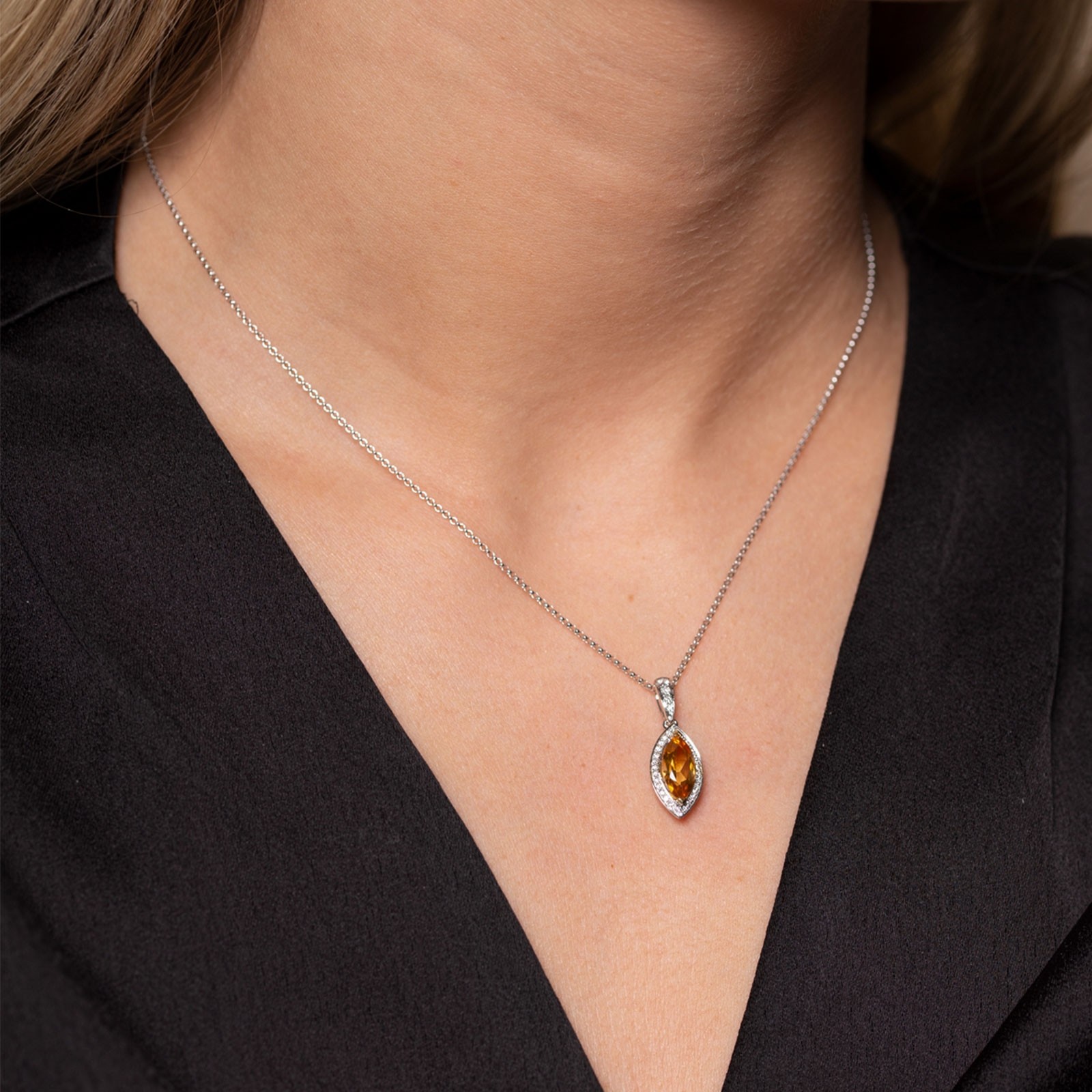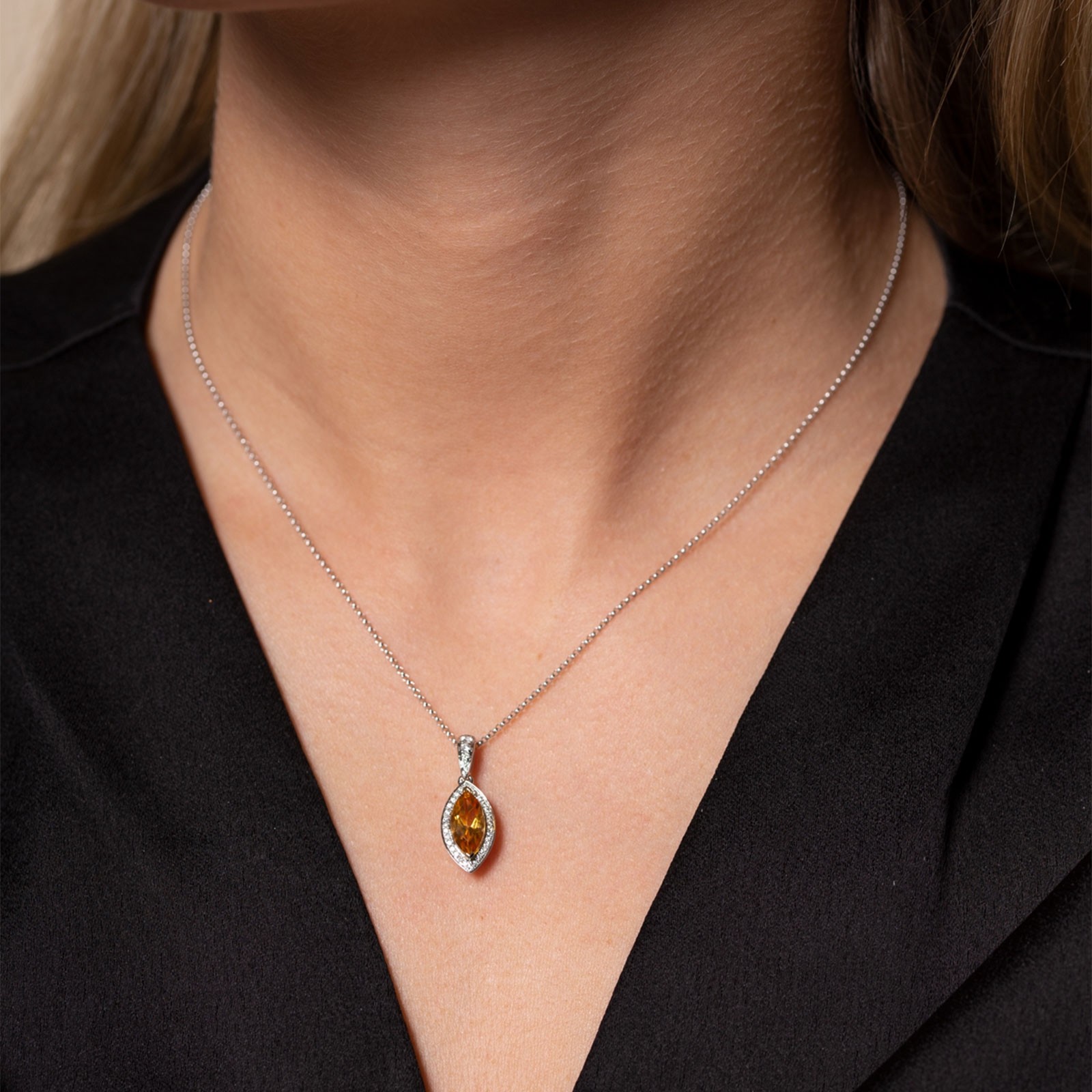 This stunning 18ct White Gold Diamond 0.13ct and Citrine 0.87ct Halo Pendant from Chisholm Hunter will produce a warm glow from the wearer’s neck. A striking marquise cut citrine is surrounded by a sparkling diamond halo, set on smooth white gold on a fine chain. This piece will look elegant when style with the matching citrine items.