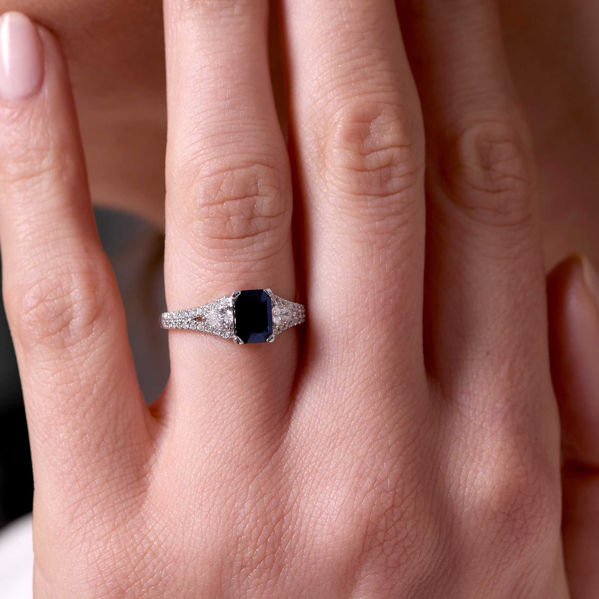 A classic three stone design adds balance and meaning. The blue sapphire sits between two diamonds for added fire and brilliance. The cool tone of white gold complements the blue hue and suits daily wear as well as special occasions. This ring makes a thoughtful choice for her, for an engagement, anniversary or milestone.