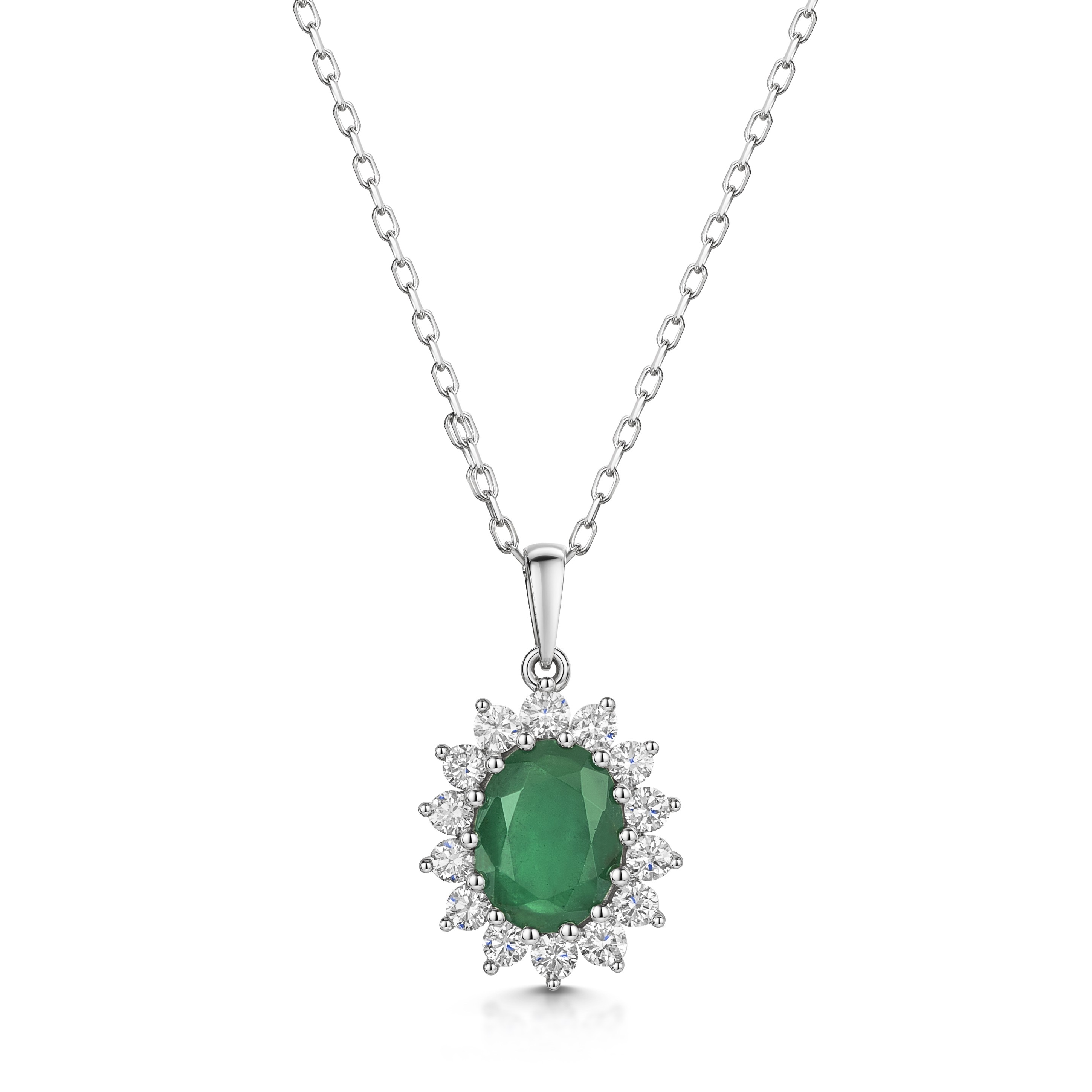 18ct White Gold Oval 1.75ct Emerald and 0.55ct Diamond Pendant