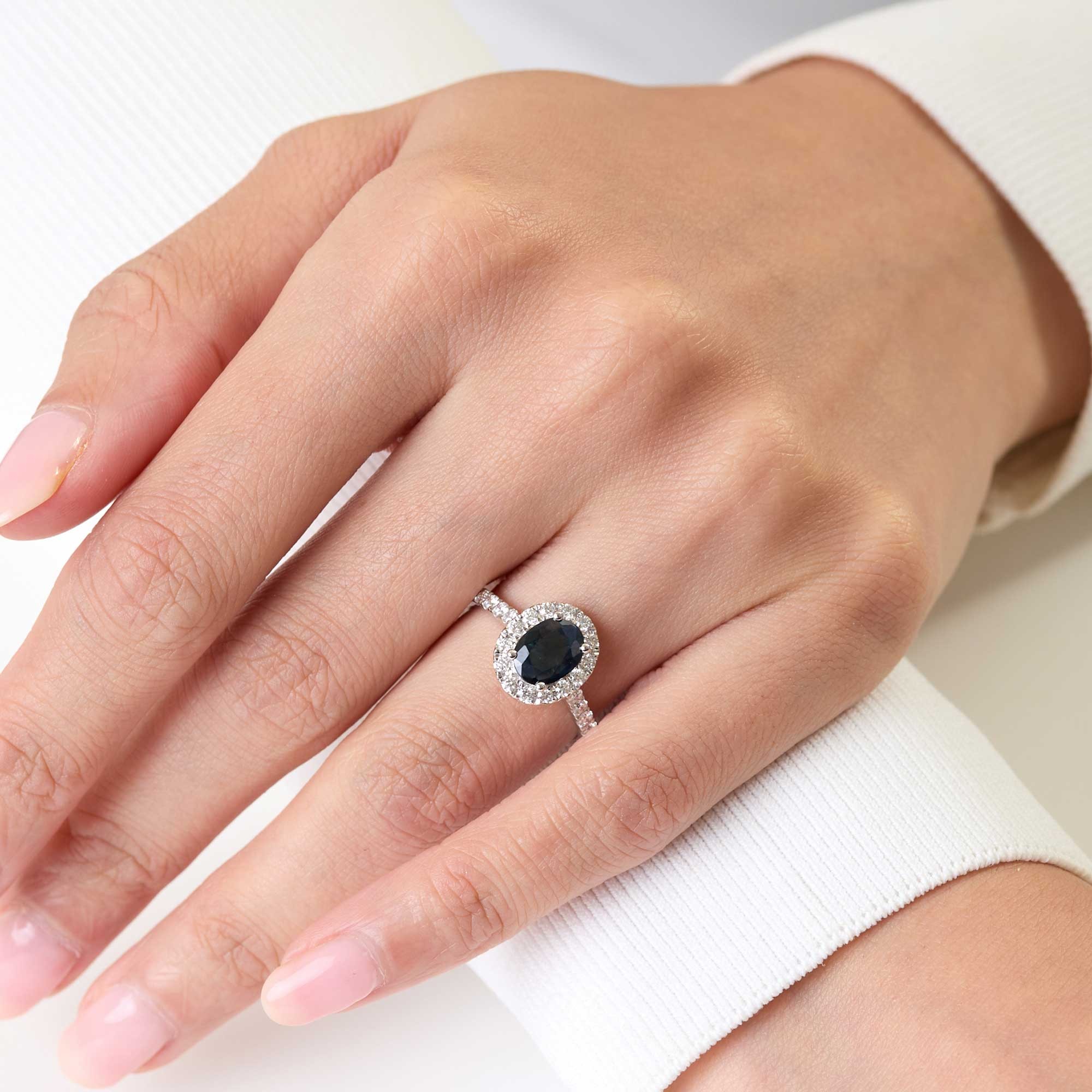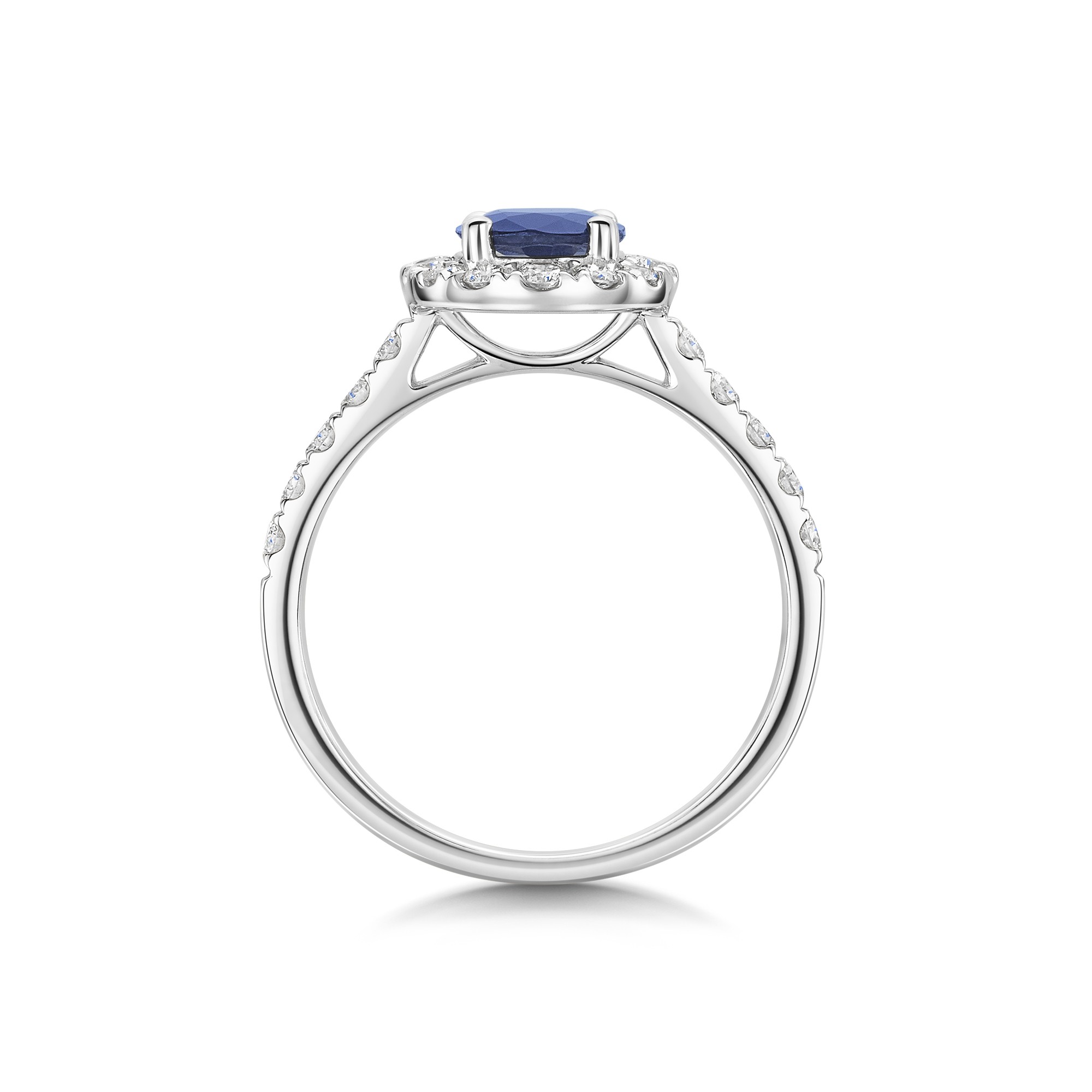 This refined ring centres a 1.40ct oval cut blue sapphire. A halo of diamonds frames the sapphire, with diamond-set shoulders for added fire. The cool tone of 18ct white gold complements the rich blue hue. Designed for her, it offers timeless style with modern polish.