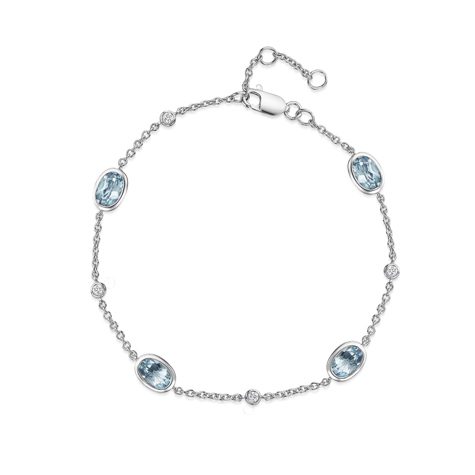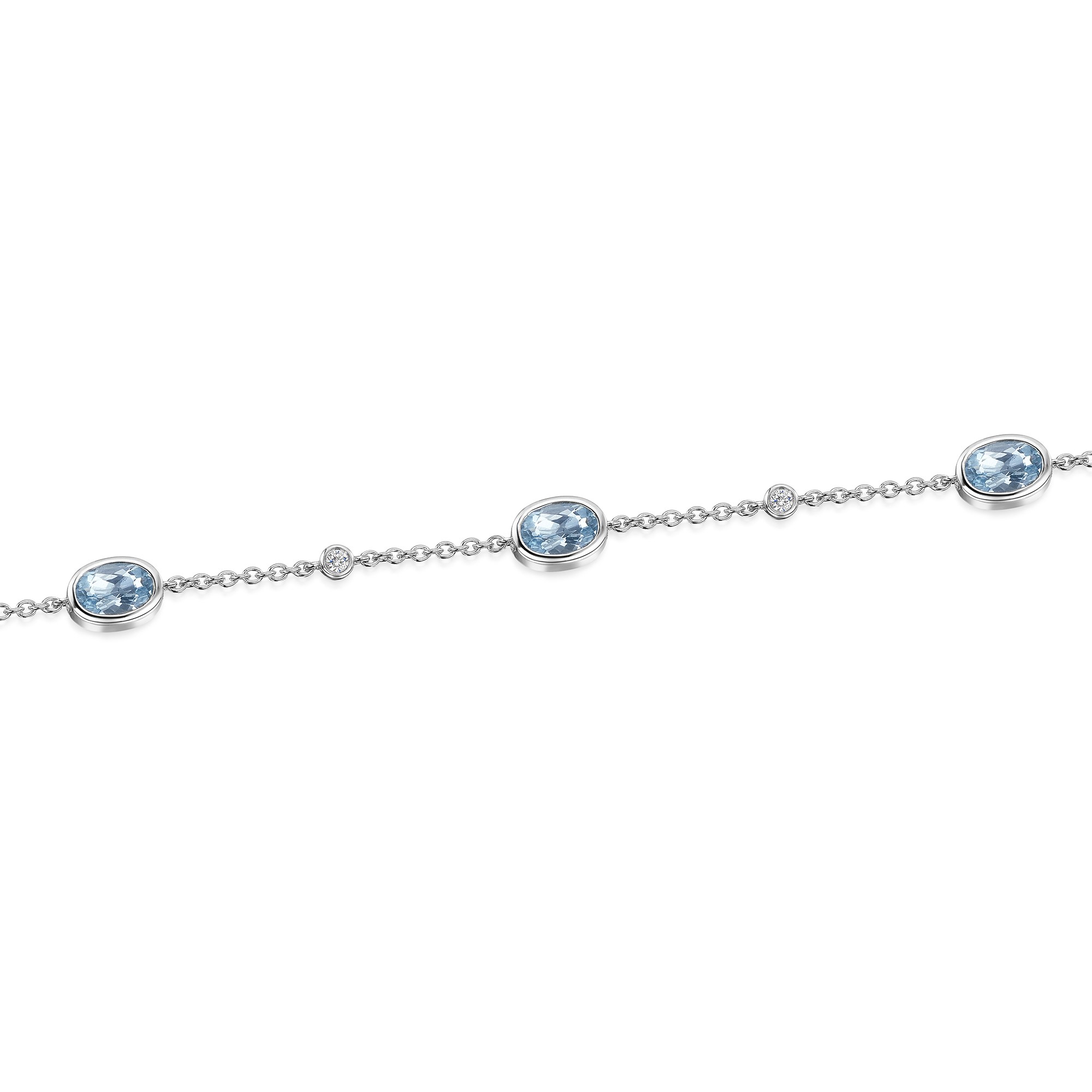 Introducing the exquisite 18ct White Gold Oval Cut Aquamarine 4.75ct and Diamond Bracelet from Chisholm Hunter. This stunning piece is designed for her, crafted from high-quality white gold that complements its captivating blue aquamarine gemstone. The centre stone, with an impressive weight of 4.75ct, features a refined oval cut, showcasing its brilliant colour.