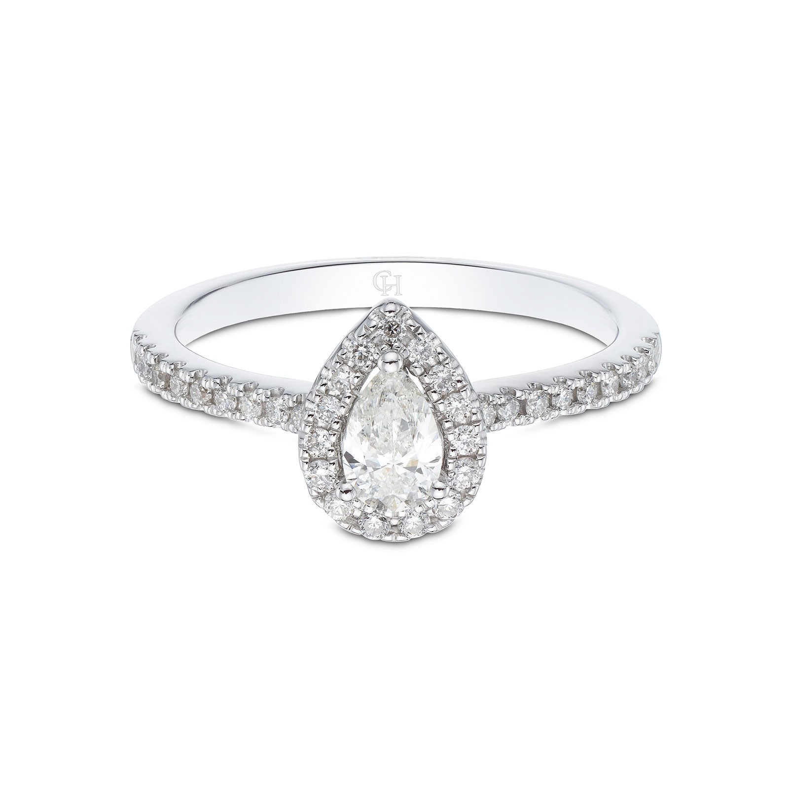 Showcasing a vintage inspired glamour that is certain to take your loved one's breath away, this 18ct white gold 0.50 total carat weight pear shaped diamond engagement ring is certain to make her feel like a princesss. A stunning 0.30ct pear shaped diamond is surrounded by a halo of dazzling round brilliant cut diamonds and further enhanced by diamond set shoulders. Diamond Information: Cut - Pear Cut, Colour - G-H, Clarity - SI1-SI2, Carat Weight - 0.50ct