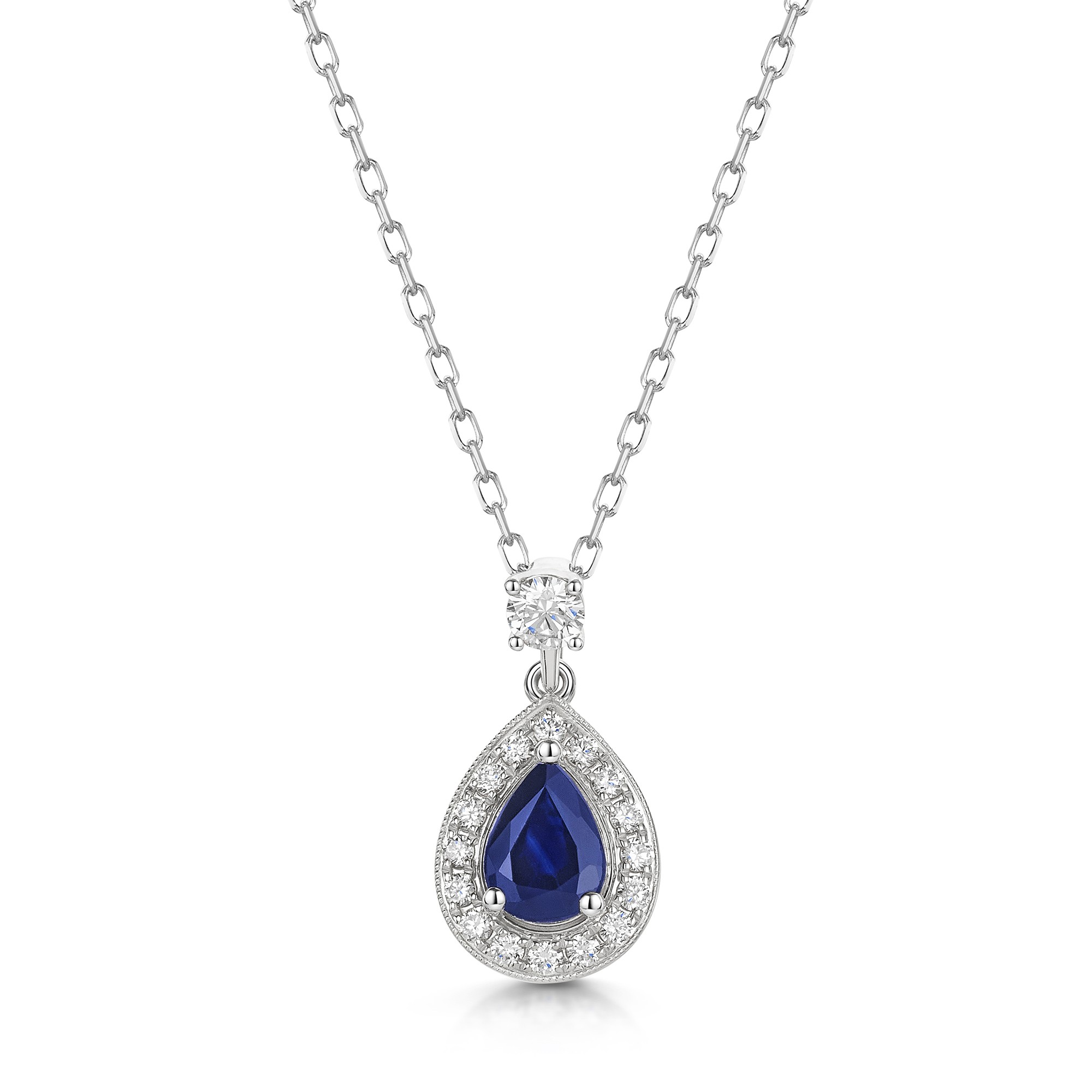 18ct White Gold Pear Cut Blue Sapphire with Diamond Halo Drop Pendant