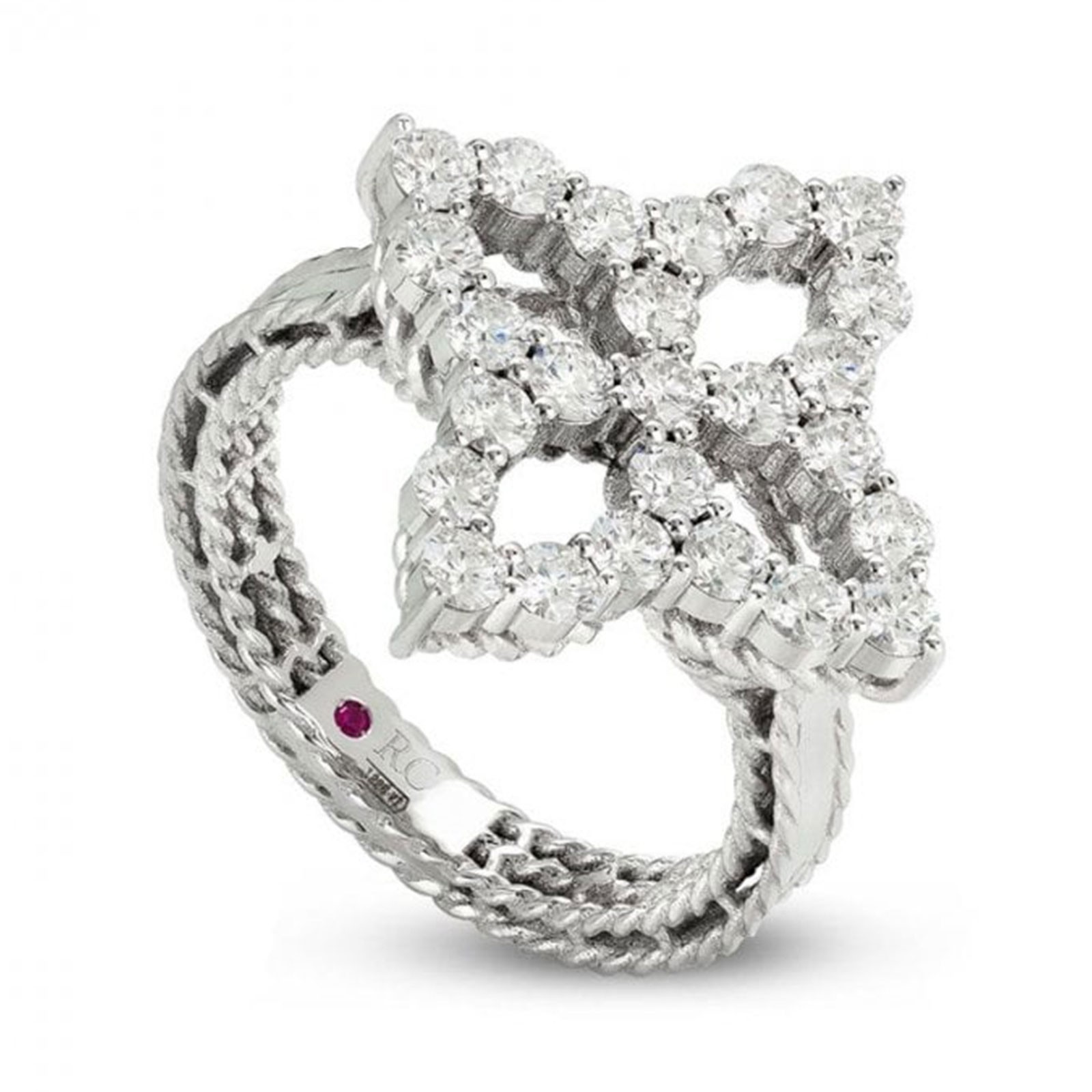 Roberto Coin's Princess Flower collection promotes a life filled with health and happiness for the wearer. This beautiful ring is crafted from 18ct white gold and features a statement 0.49ct diamond flower embellishment. Complete with rope effect edging, pair this unique ring with matching pieces from the Roberto Coin Princess Flower collection. We offer Roberto Coin 2 years official guarantee and branded presentation packaging. Discover this premium brand at Chisholm Hunter today.