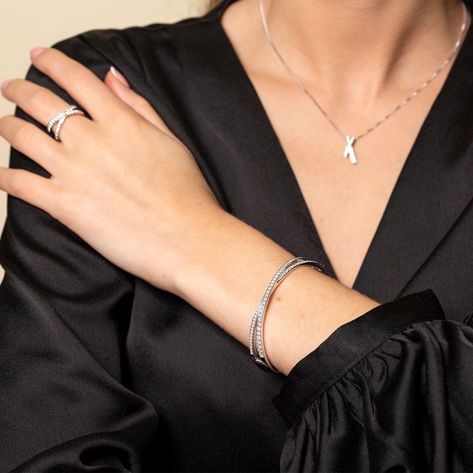 Add some sparkle to your everyday style with our stunning crossover bangle. Masterfully crafted from 18ct white gold, this contemporary bangle features two rows of round brilliant cut 2.37ct white diamonds, that beautifully cross-over in the centre. Wear alone as a single statement or pair with the matching pendant necklace, earrings and ring for maximum impact.
