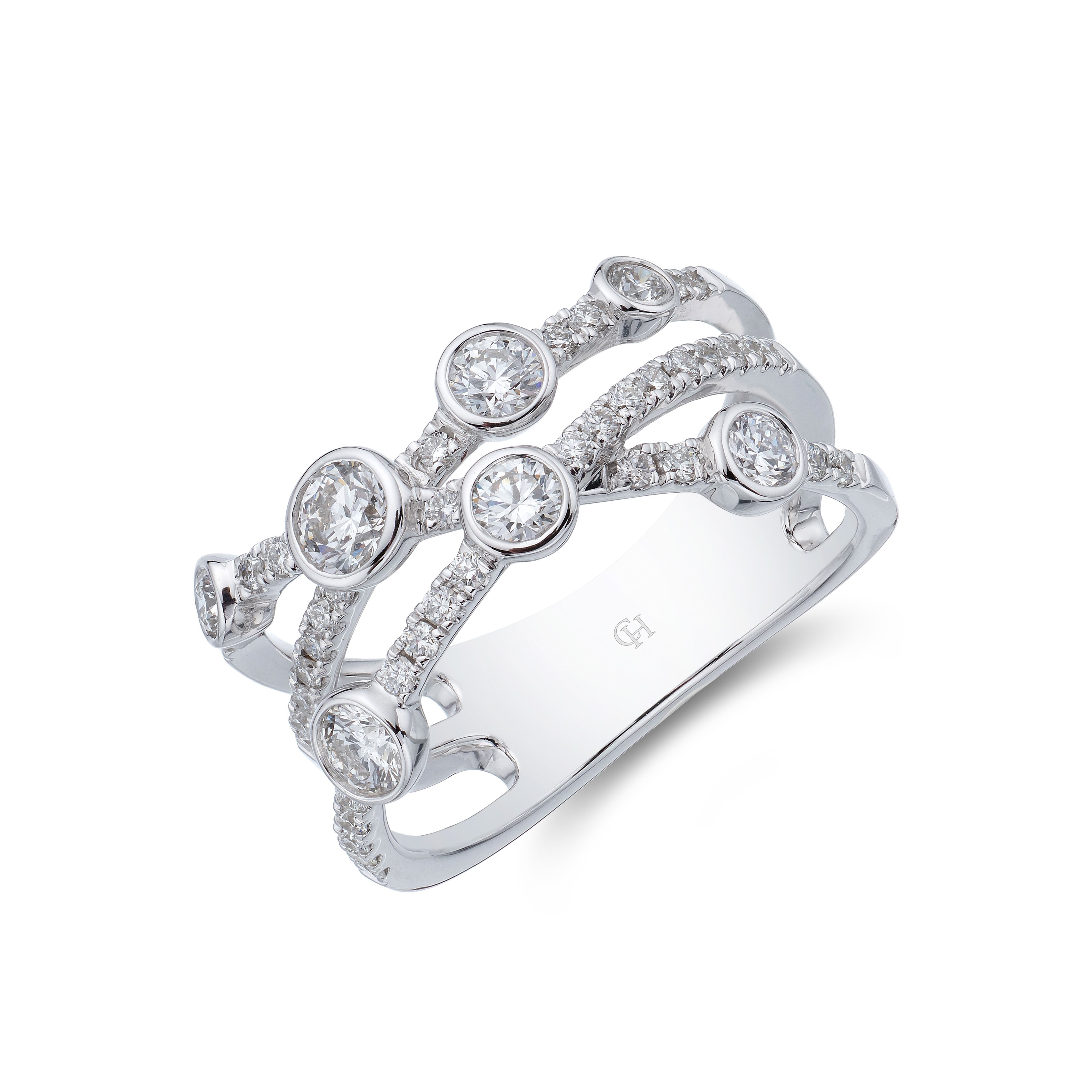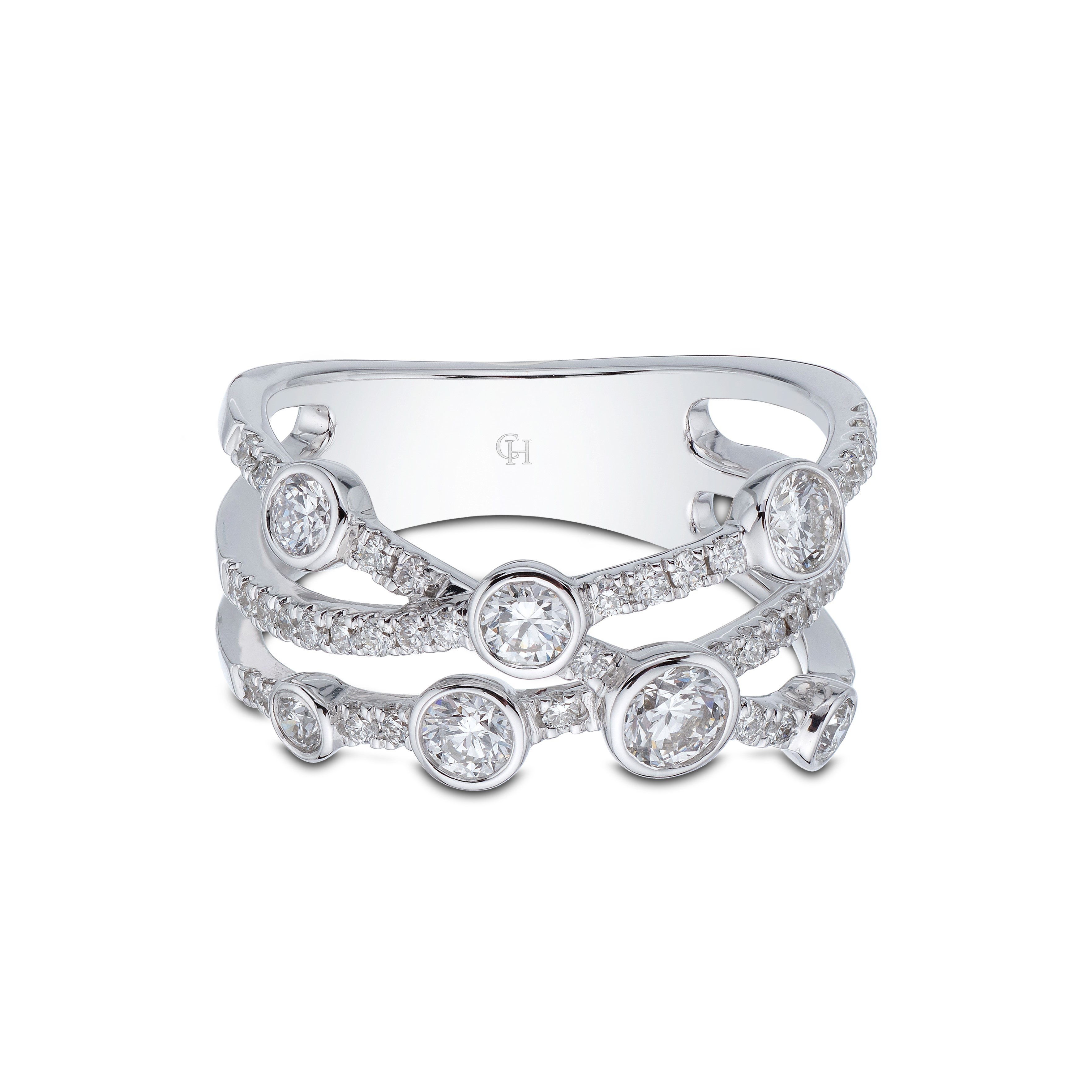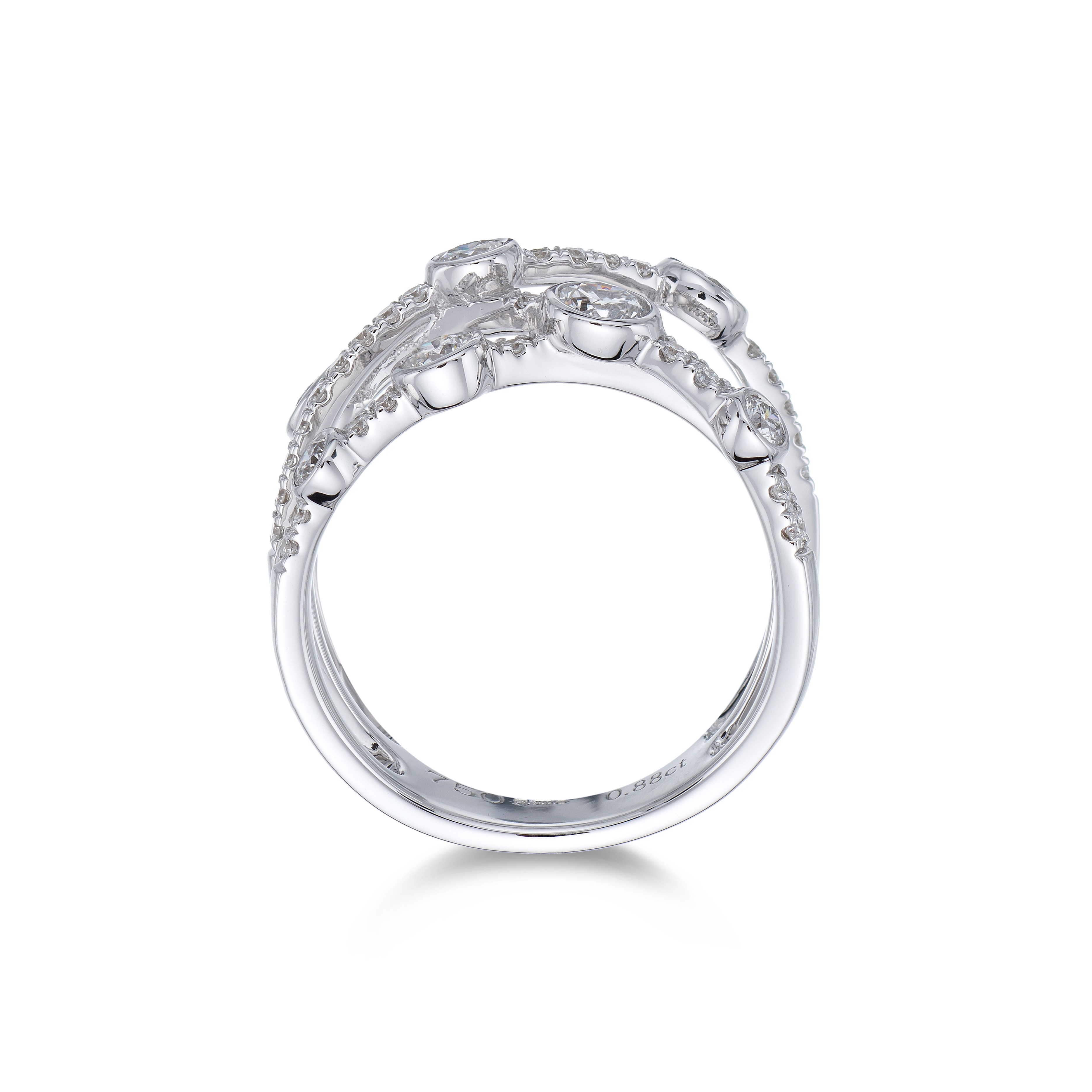 Expertly crafted from 18ct white gold, our fancy band ring is designed in a rub over setting to beautifully encapsulate the round brilliant cut 0.89ct diamonds. In a multi-band crossover design, style this statement ring on its own, or alongside the matching necklace and earrings.