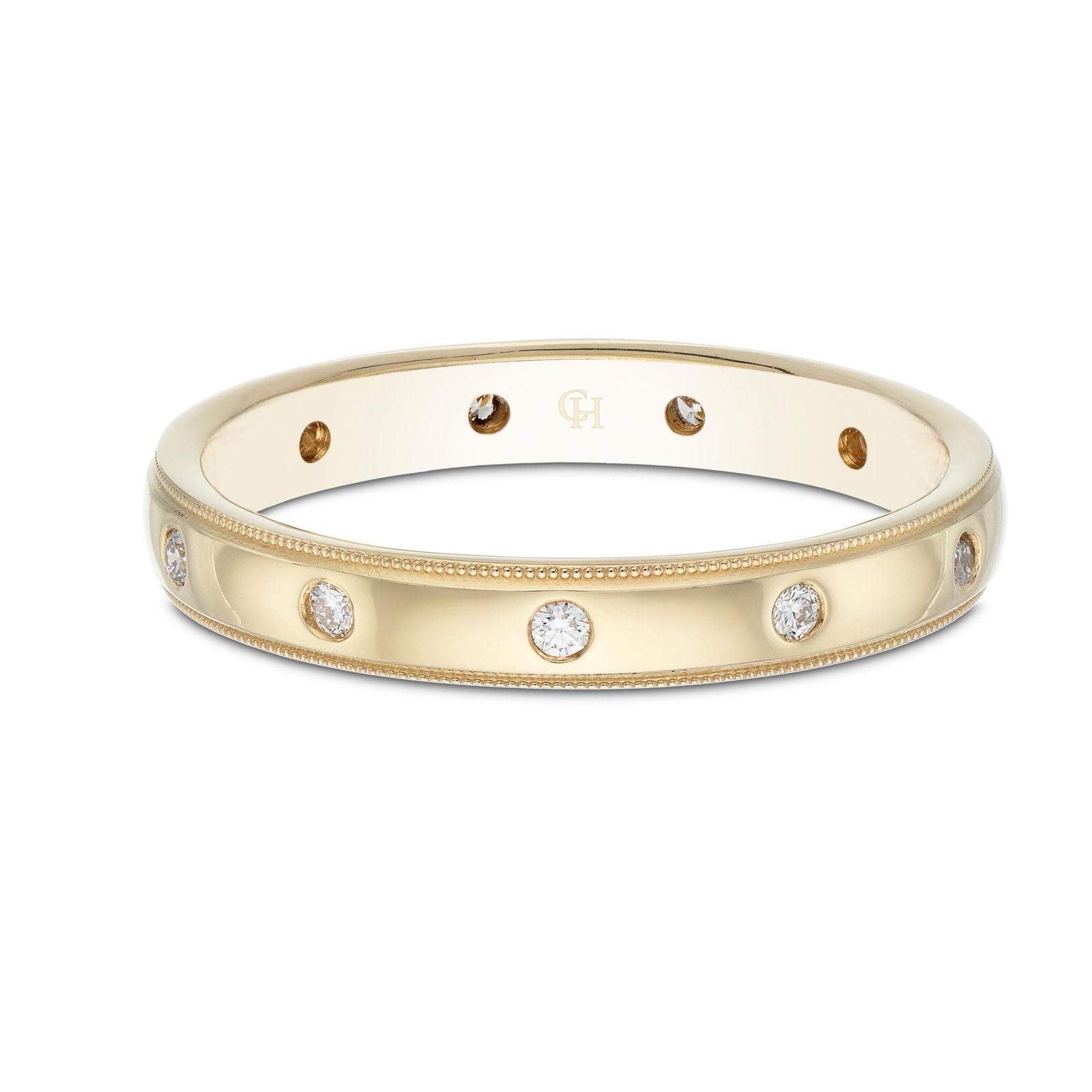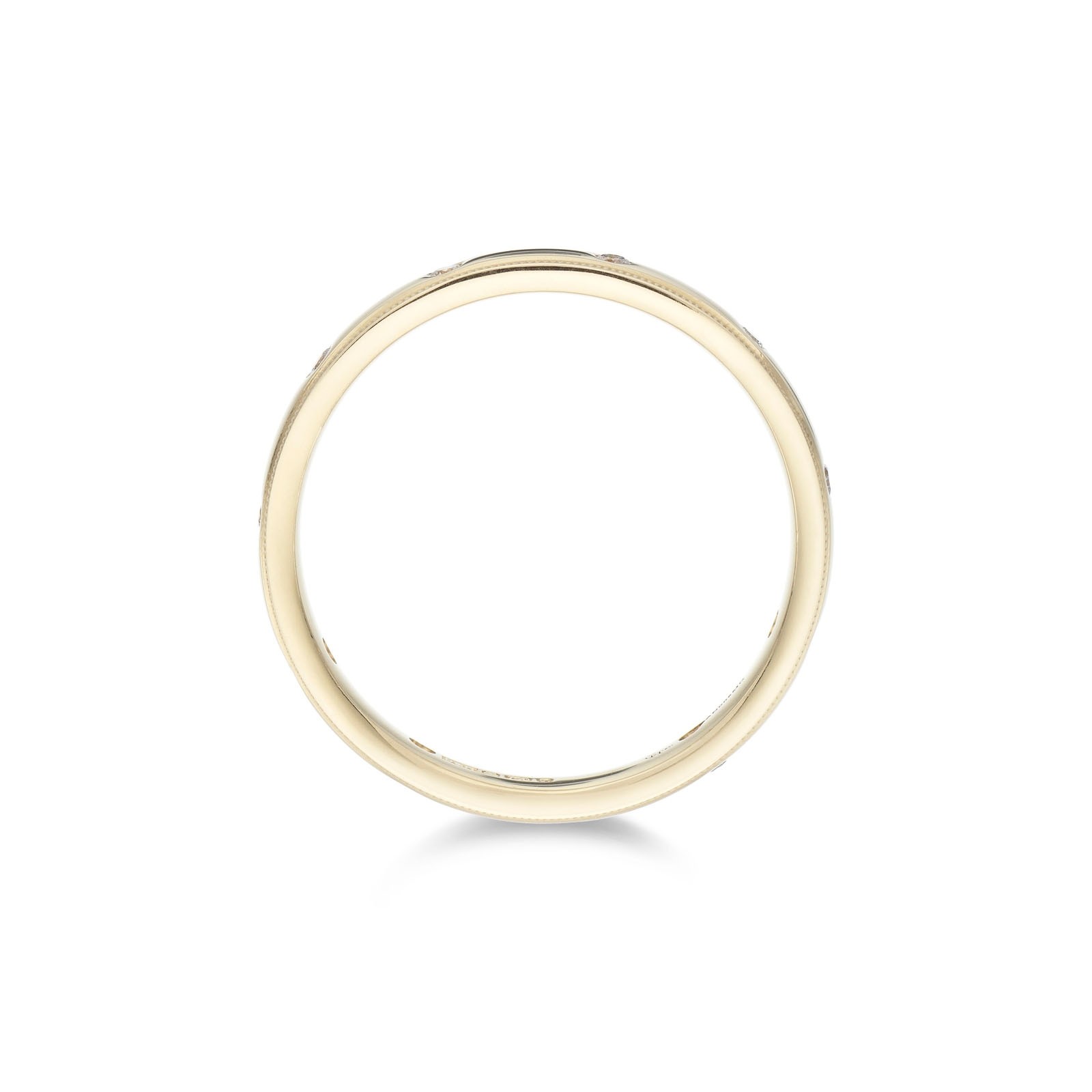 Wonderfully elegant, this 18ct yellow gold diamond eternity wedding ring is a wonderful token of your eternal love and commitment for one another. A polished yellow band is set with delicate sparkling diamonds, with a total carat weight of 0.10, and finished with a milgrain edge in a beautiful design that will forever be cherished and loved.