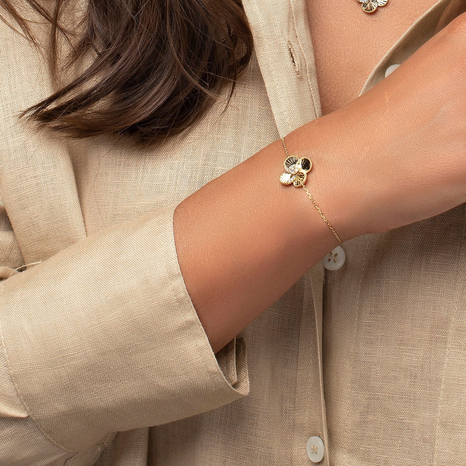 This stunning textured flower diamond bracelet is designed to create the ultimate statement. A handful of exquisite round brilliant diamonds are placed within the centre of the flower motif adding shimmering beauty. Crafted from 18ct yellow gold, decorate your wrist with luxury only from Chisholm Hunter. Diamond information: Cut- Round brilliant, Total weight- 0.20ct.