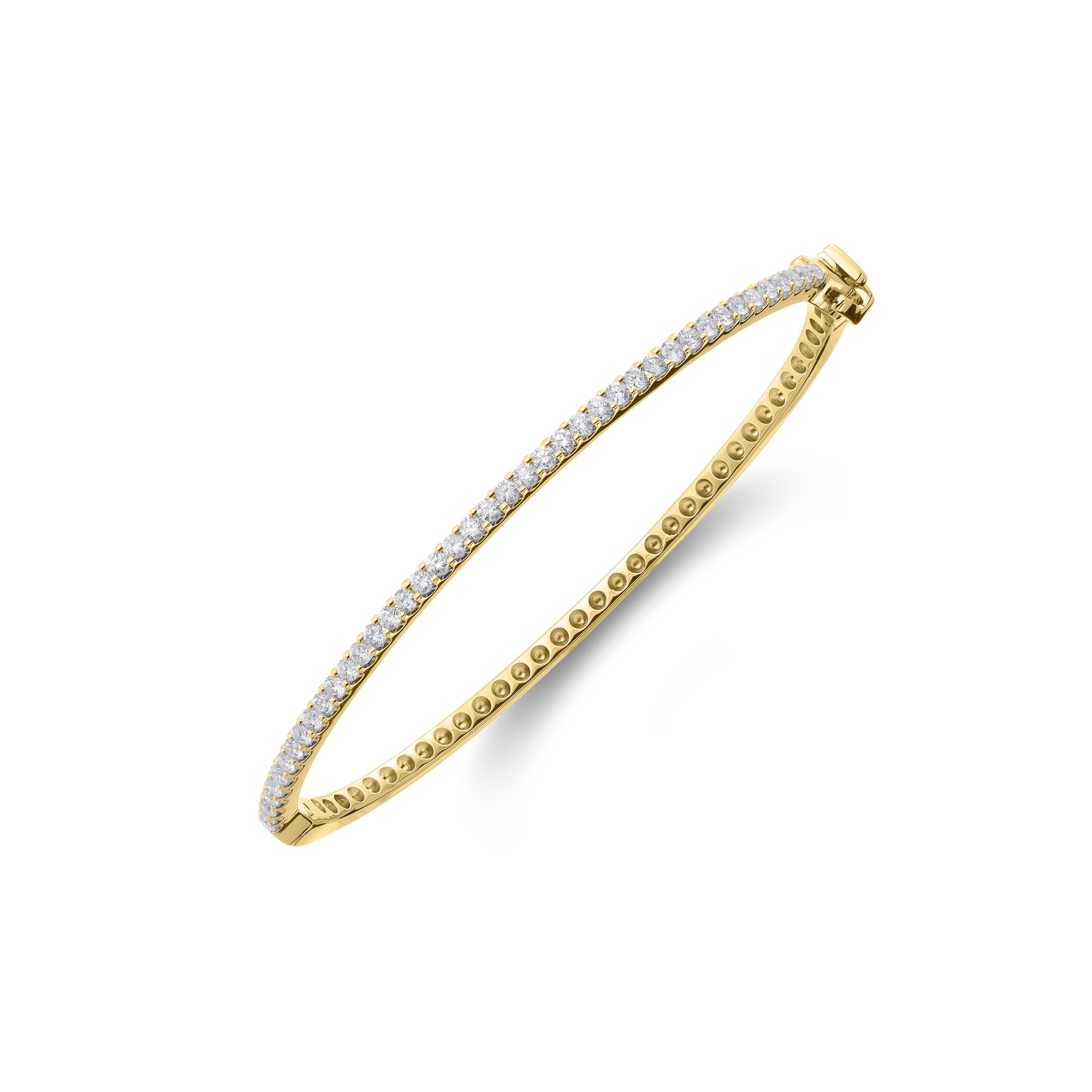 Round brilliant cut diamonds maximise light return, giving lively fire in everyday light and evening settings. The warm tone of 18ct yellow gold complements the diamonds’ brightness. Wear it solo for a pared-back look or stack it with other bracelets for added impact.