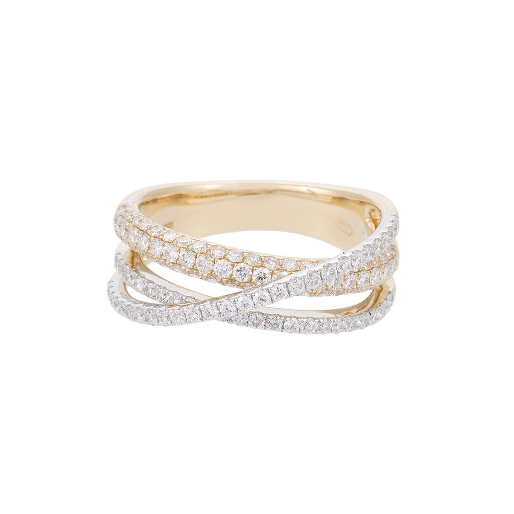 18ct yellow gold shank with round brilliant cut diamonds ring set in a cross over setting weighing 1.08ct.
