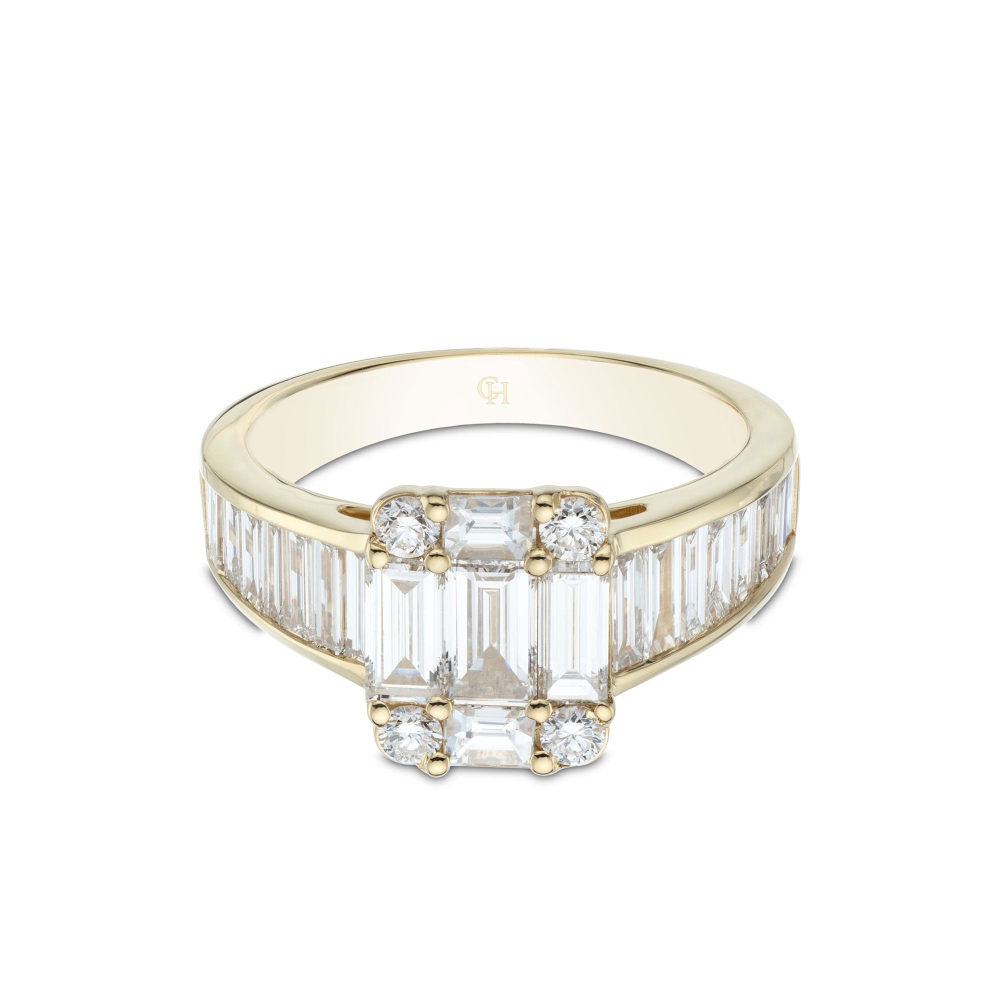 This 18ct Yellow Gold Baguette Cut 1.75ct Diamond Cluster Ring from Chisholm Hunter will instantly elevate your look. The showstopping combination of round brilliant and baguette cut diamonds set off the smooth 18ct yellow gold. This diamond piece is presented in luxury Chisholm Hunter gift packaging with a certificate of authenticity.