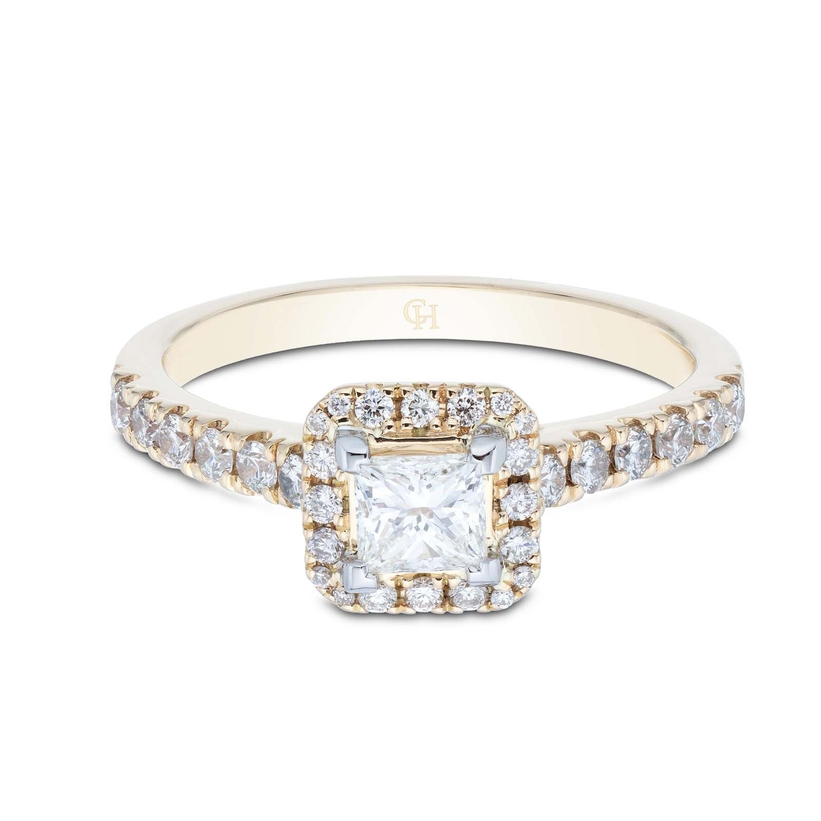 18ct Yellow Gold Princess Cut 0.50ct Diamond Halo Solitaire Ring