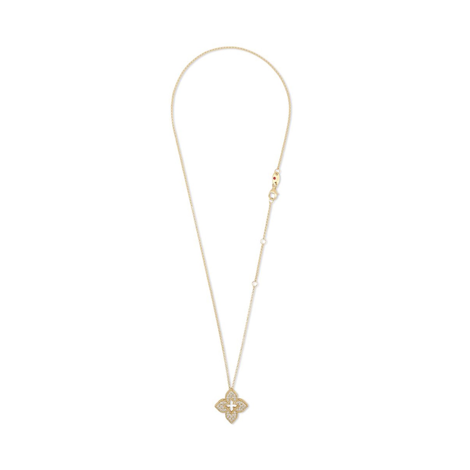 A shimmering display of pavé of diamonds shines on this floral pendant by Roberto Coin, featuring 18ct yellow gold and all the uniqueness of an handmade jewel. The design of the Venetiam Princess Collection hides within it a complex structure made of twisted wire, visible only to those who wear them. This allure of mystery is a reminder of Venice, famous for its countless legends and secrets passed from generation to generation.