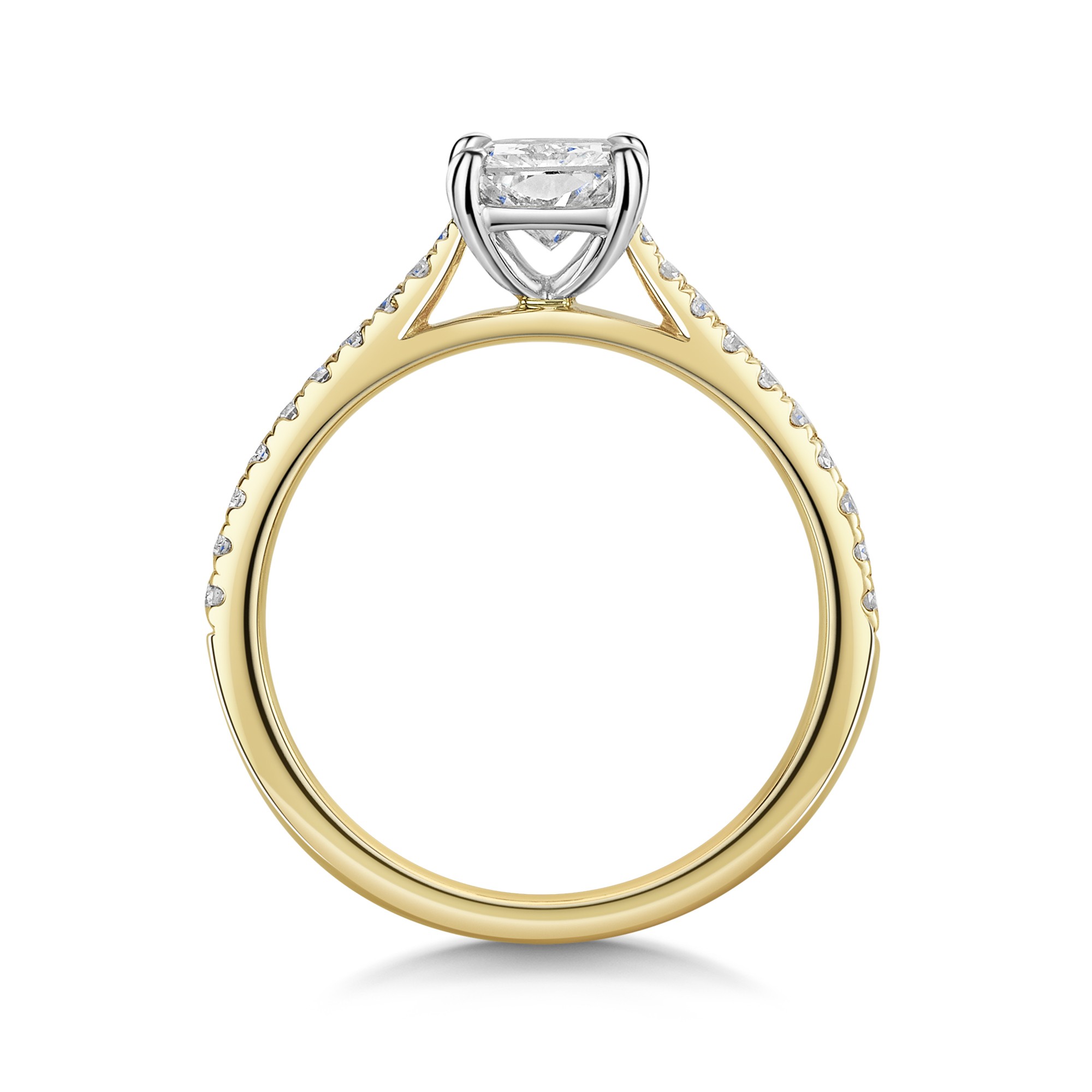 Introducing the 18ct Yellow Gold Radiant Cut 1.50ct Lab Grown Diamond Ring with Diamond Shoulders from Chisholm Hunter. This exquisite ring is crafted from premium yellow gold, perfectly complementing the centre lab-grown diamond.