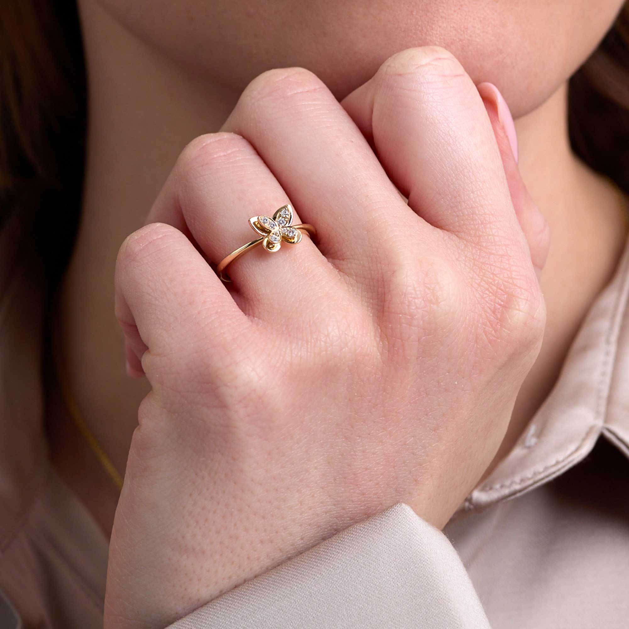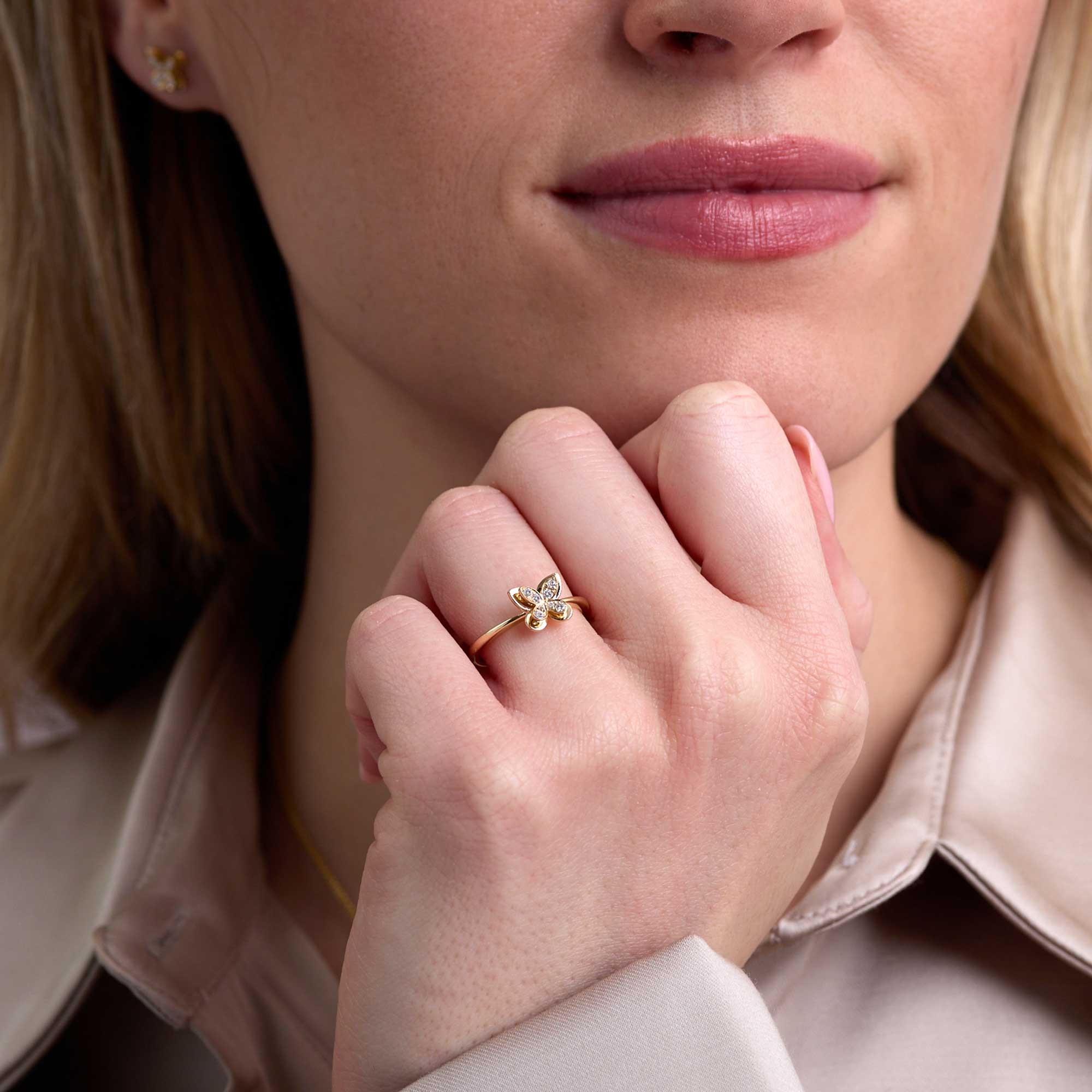 Each diamond is H–I colour and SI2 clarity, selected for bright, consistent sparkle. The round brilliant cut maximises light return, giving the butterfly crisp definition. The slim band sits comfortably on the finger and pairs well with other rings or wears beautifully solo.