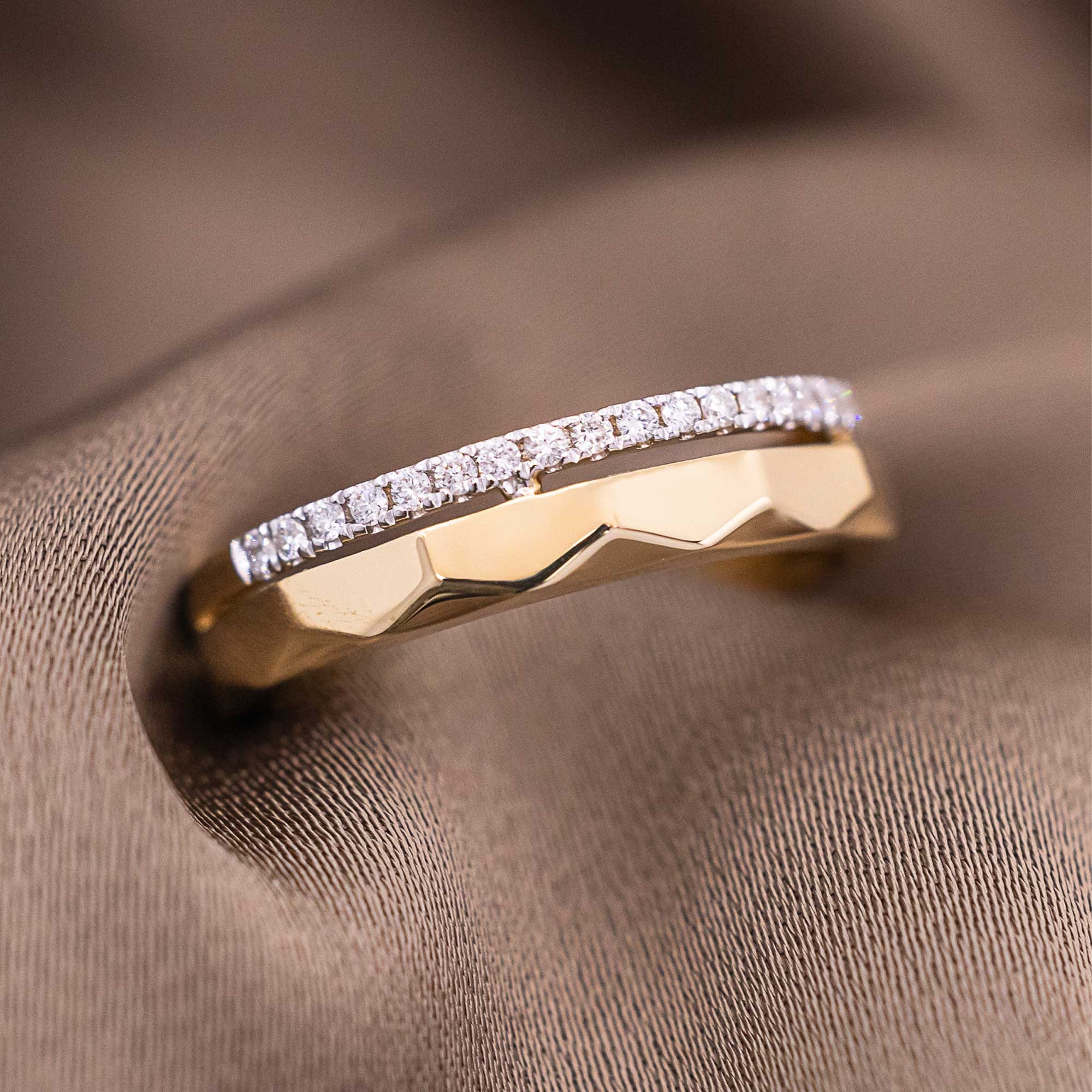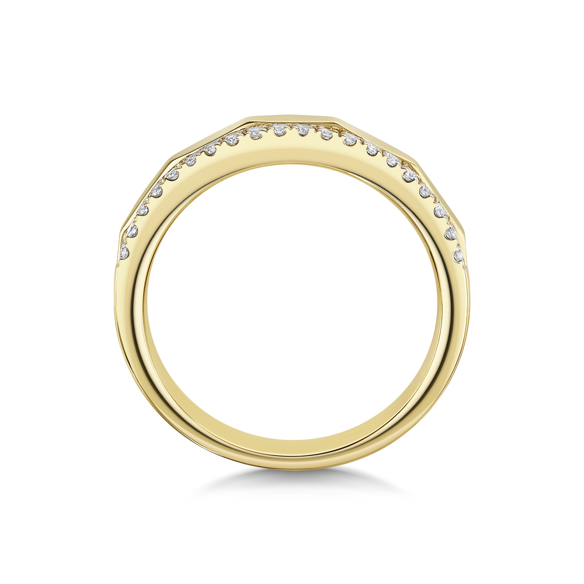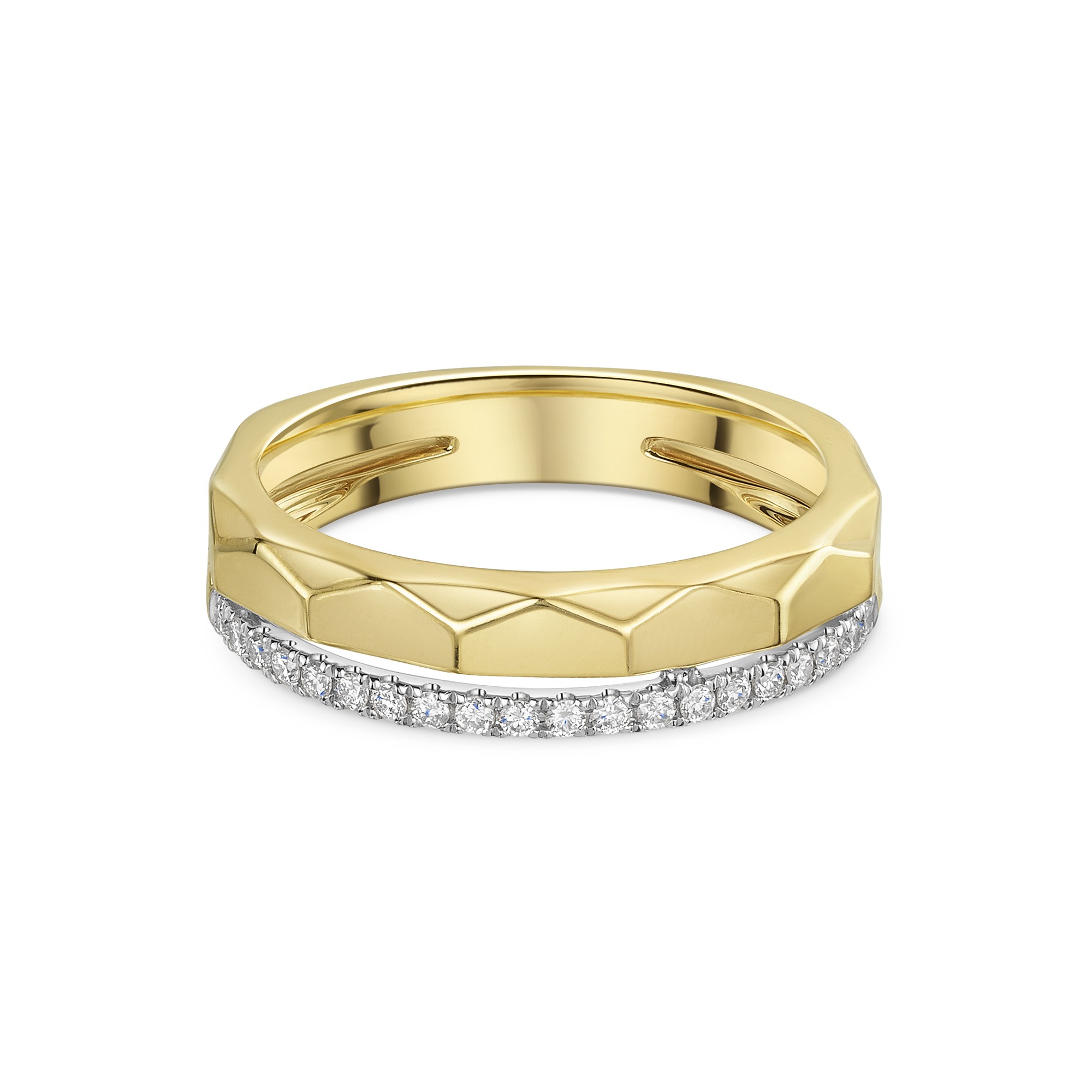 This 18ct Yellow Gold Round Brilliant 0.15ct Diamond Double Row Fancy Band from Chisholm Hunter delivers clean lines with subtle detail. Two parallel bands create a modern stacked look. One band is set with round brilliant cut, clear diamonds totalling 0.15ct, graded H–I colour and SI2 clarity for reliable sparkle. The other is smooth 18ct yellow gold with a geometric finish that adds depth and interest.