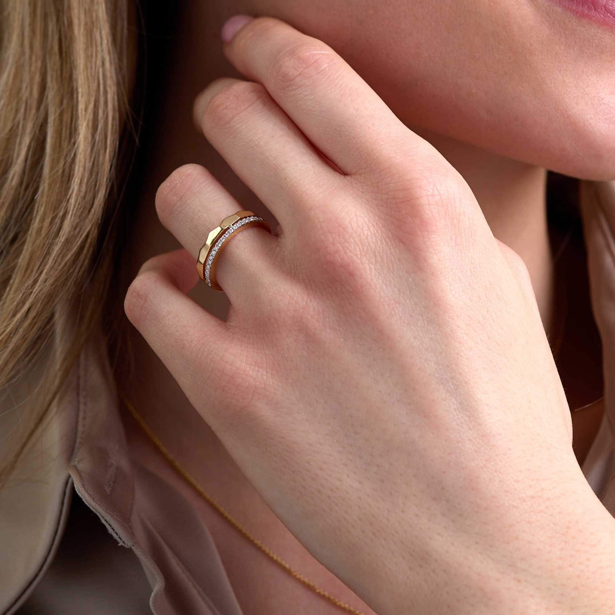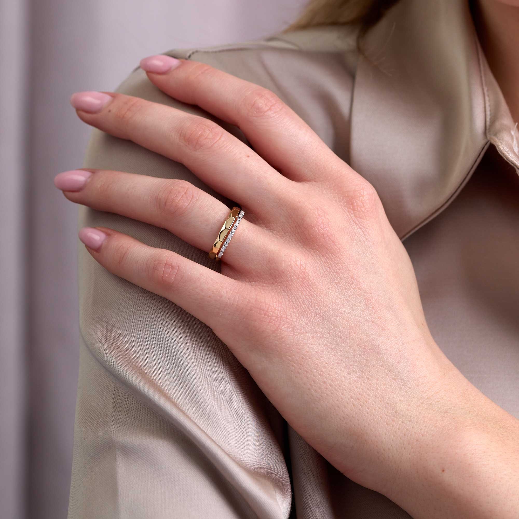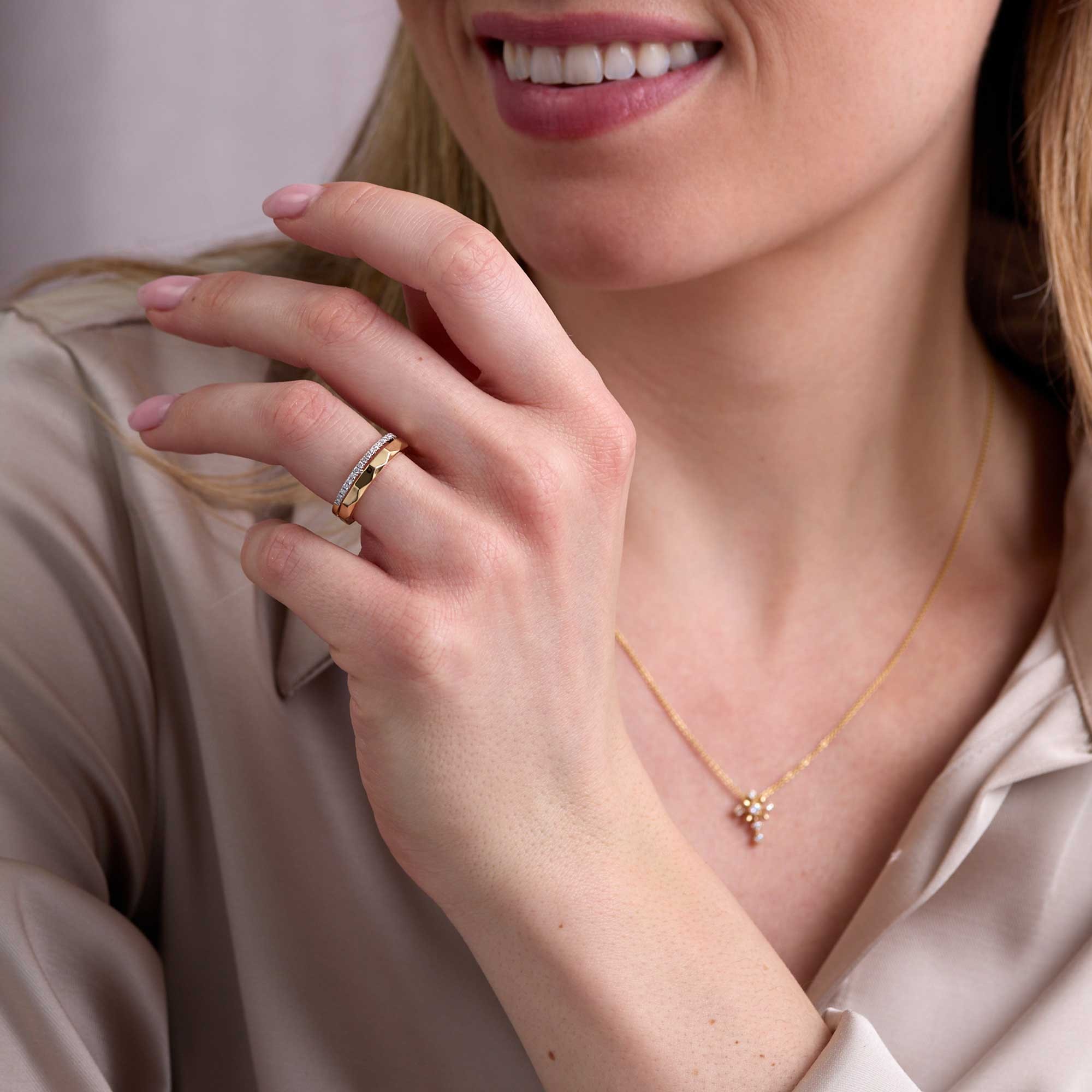 This 18ct Yellow Gold Round Brilliant 0.15ct Diamond Double Row Fancy Band from Chisholm Hunter delivers clean lines with subtle detail. Two parallel bands create a modern stacked look. One band is set with round brilliant cut, clear diamonds totalling 0.15ct, graded H–I colour and SI2 clarity for reliable sparkle. The other is smooth 18ct yellow gold with a geometric finish that adds depth and interest.
