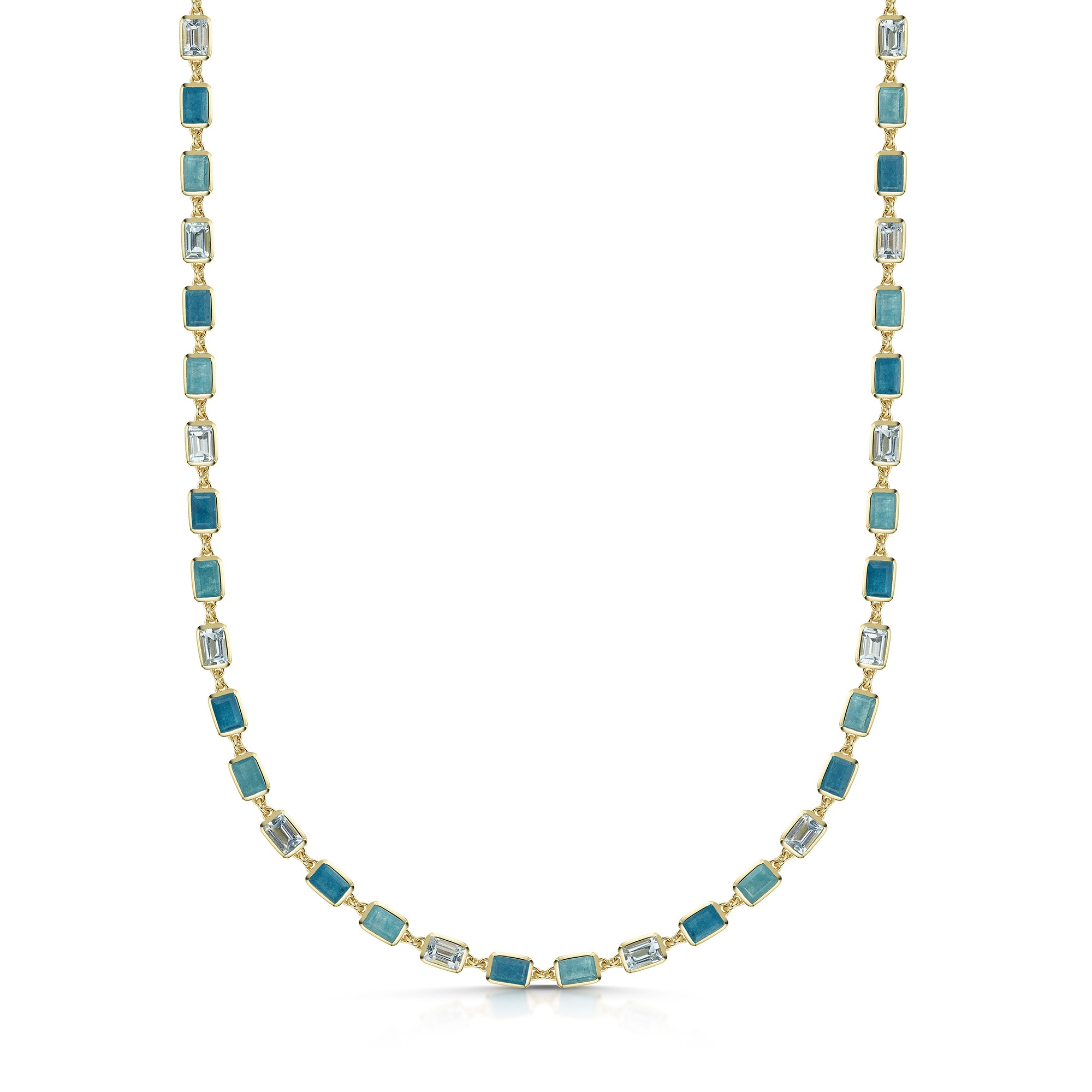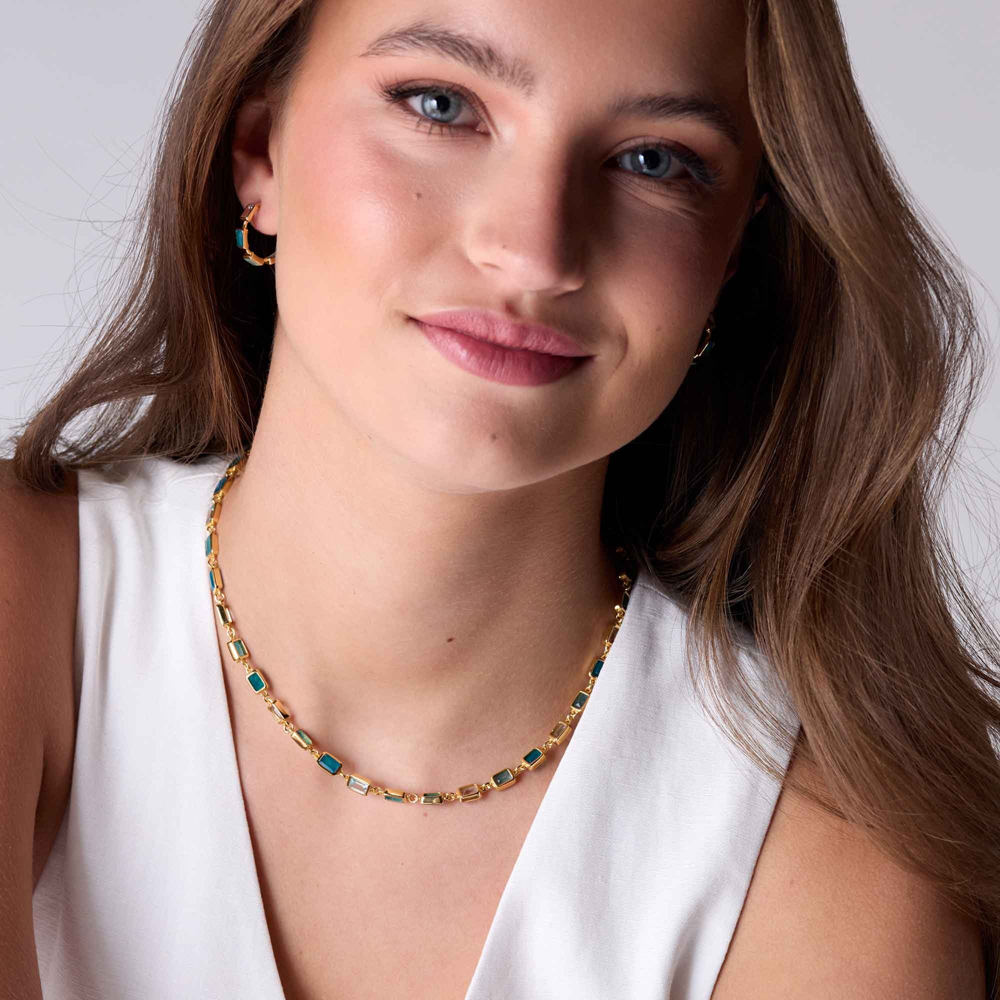 This necklace in 18ct Yellow Gold Vermeil blends luxury with colour. It features a gemstone mix, including Blue Topaz, Blue Black Jade and Green White Jade. The Blue Black Jade & Green White Jade Necklet catches light across every facet. Expertly crafted with a durable 3-micron plating layered over 925 sterling silver this piece delivers a refined finish.