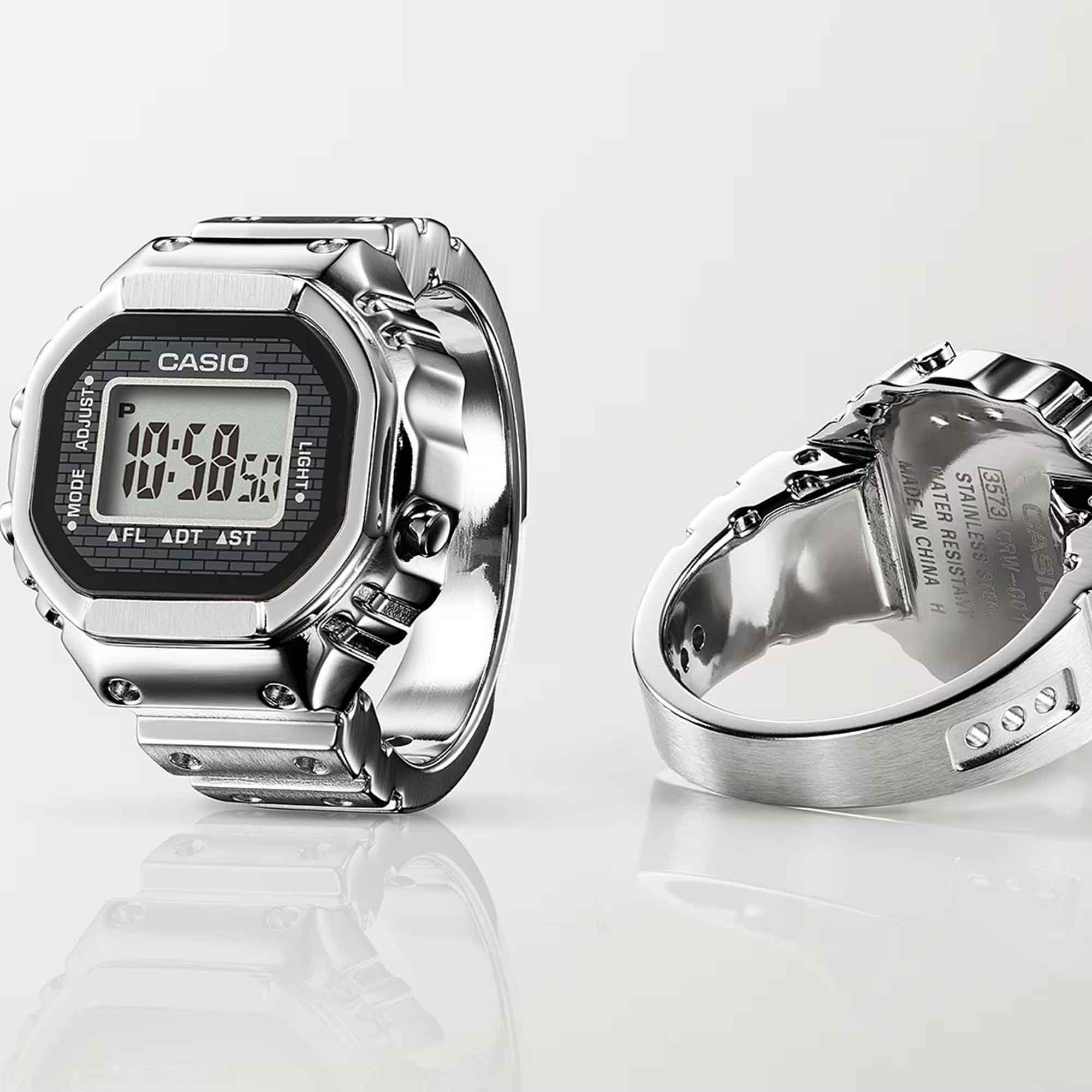 Crafted entirely from metal, the ring faithfully replicates the intricate details of a classic Casio watch at a fraction of the size. The airtight construction is enforced by innovative glass bonding technology, making the watch waterproof and perfect for daily use.