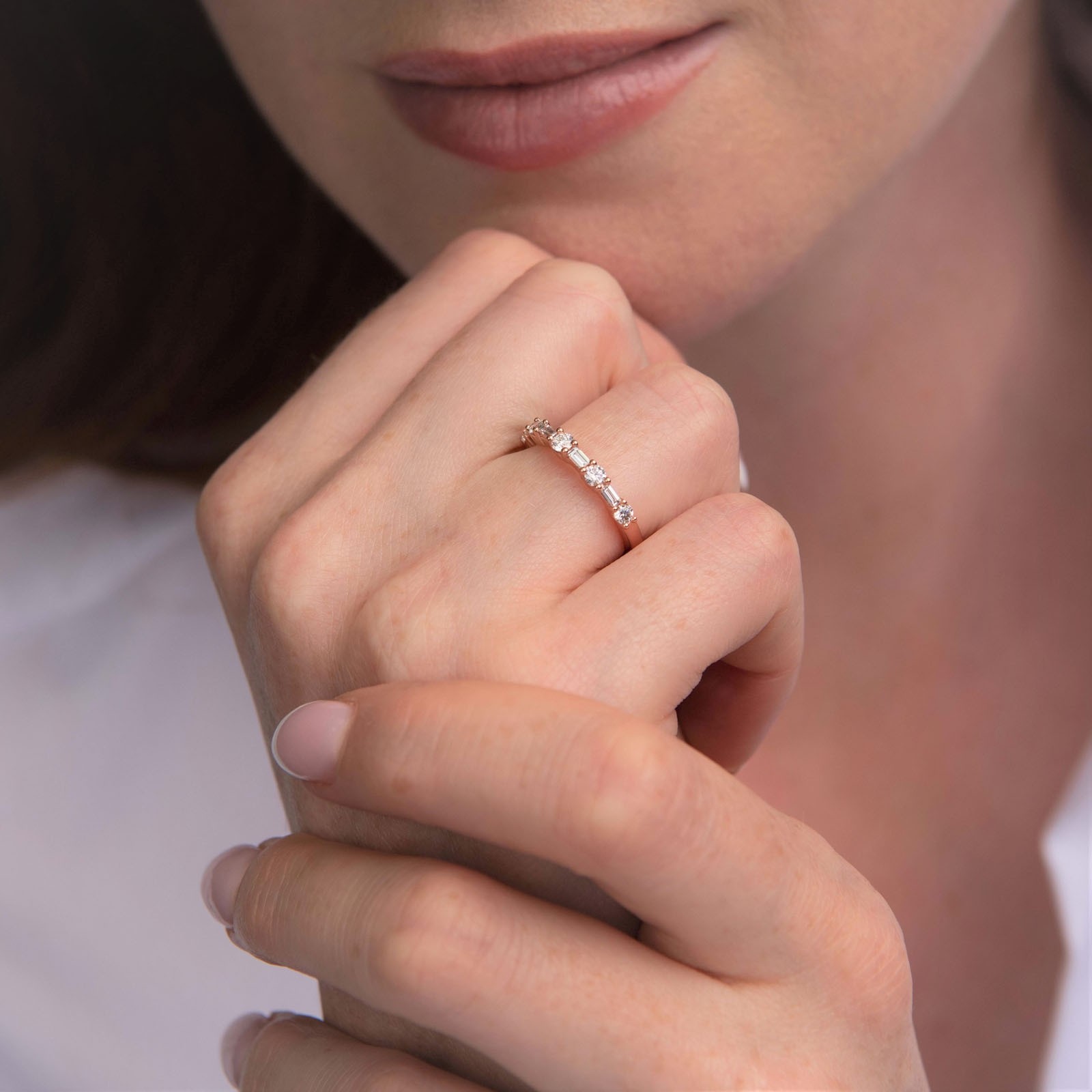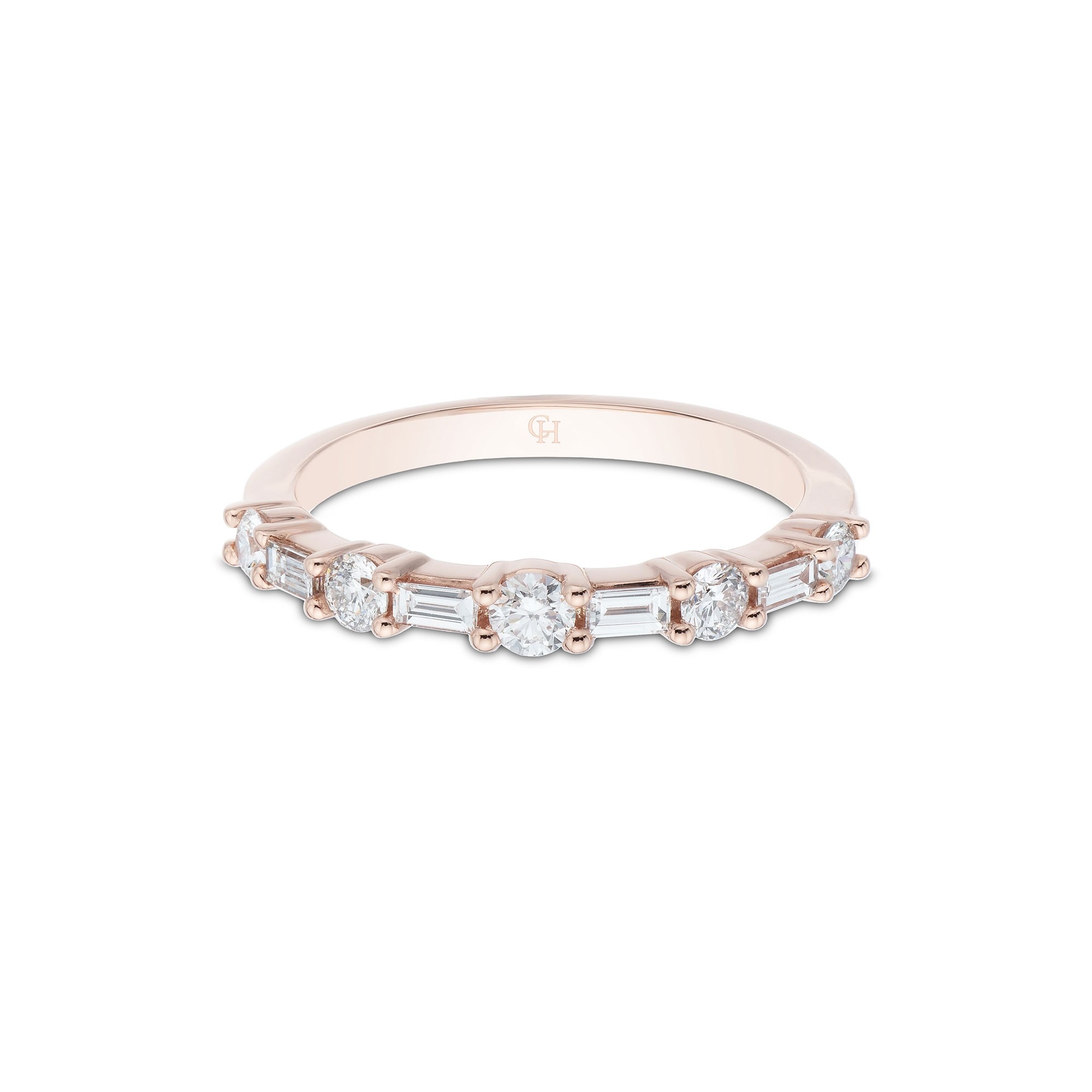 This dainty and feminine 9ct Rose Gold Brilliant and Baguette Cut 0.49ct Diamond Eternity Ring is the perfect addition to your loved one’s hand. The beautiful mixed cut diamonds sit delicately along the expertly crafted smooth rose gold band and will catch the light with movement. Presented in Chisholm Hunter luxury packaging.