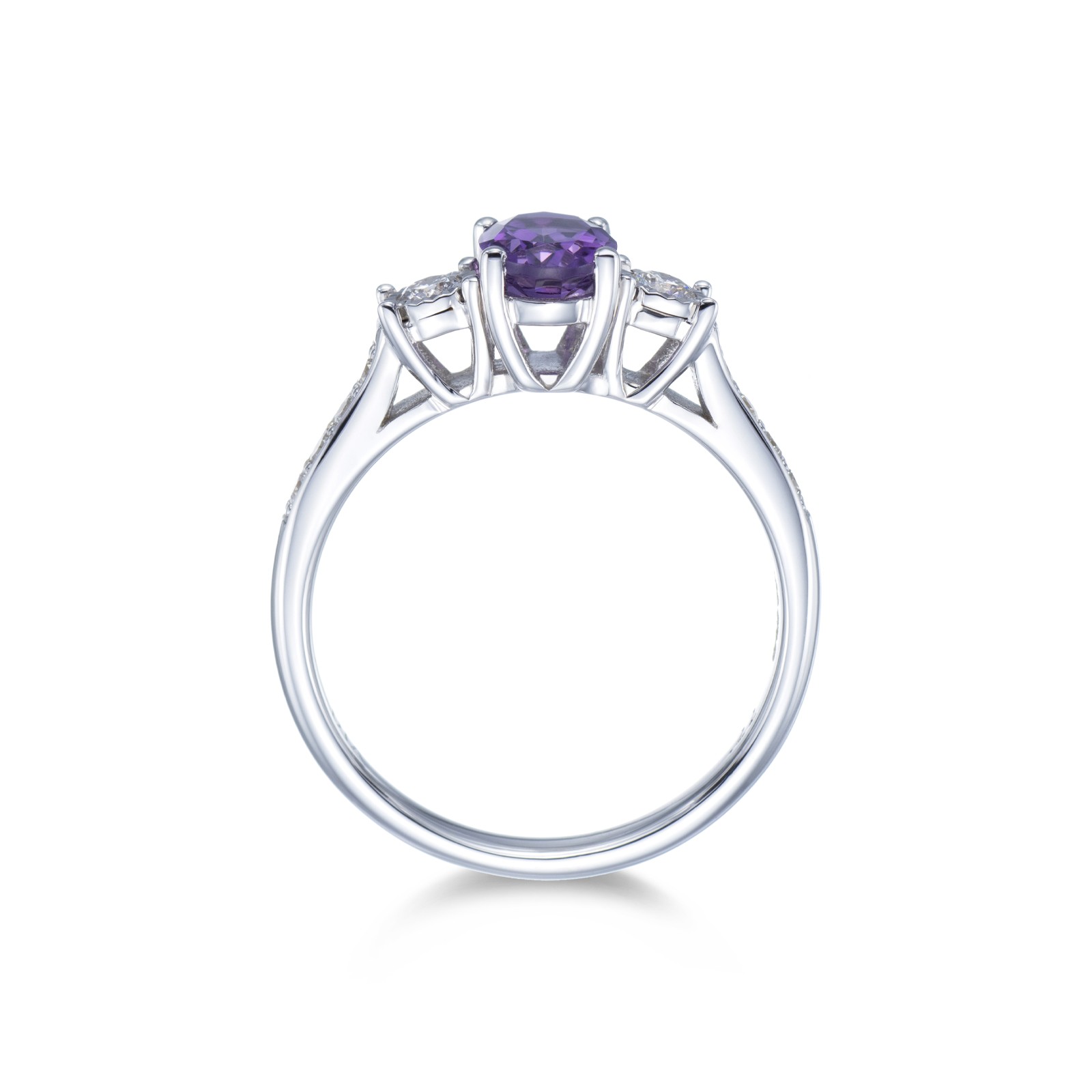 A classic style with a modern twist, this 9ct White Gold 0.75ct Amethyst and 0.22ct Diamond Ring is the most beautiful way to celebrate an anniversary, mark an important mile stone, or just to say "I love you". Presented in a clean, elegant and classic 4 claw setting, a striking oval 0.75ct amethyst stone sits between two diamond side stones, set on a sparkling diamond shoulder band for a dazzling sparkle. (Diamond total ct weight: 0.22ct).