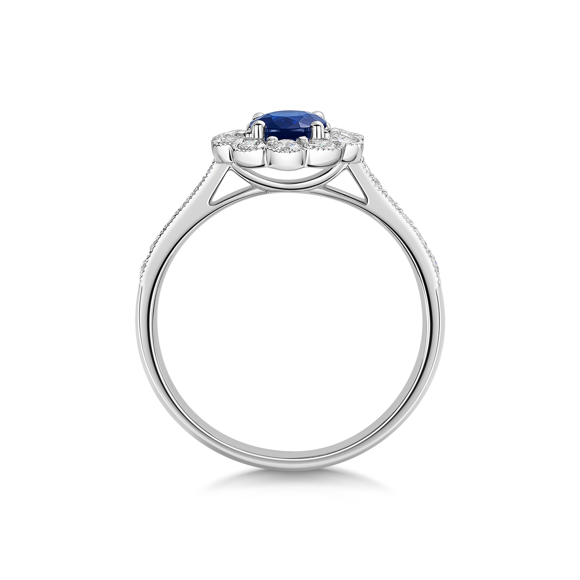 The sapphire measures 0.60ct, reflecting a rich colour that beautifully contrasts with the gleaming 9ct white gold band. The lab-grown diamond halo adds a touch of brilliance, enhancing the sapphire’s allure. Crafted with precision, each diamond in the halo meets high clarity and colour grading standards, ensuring exceptional quality.