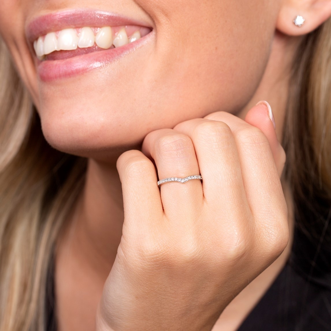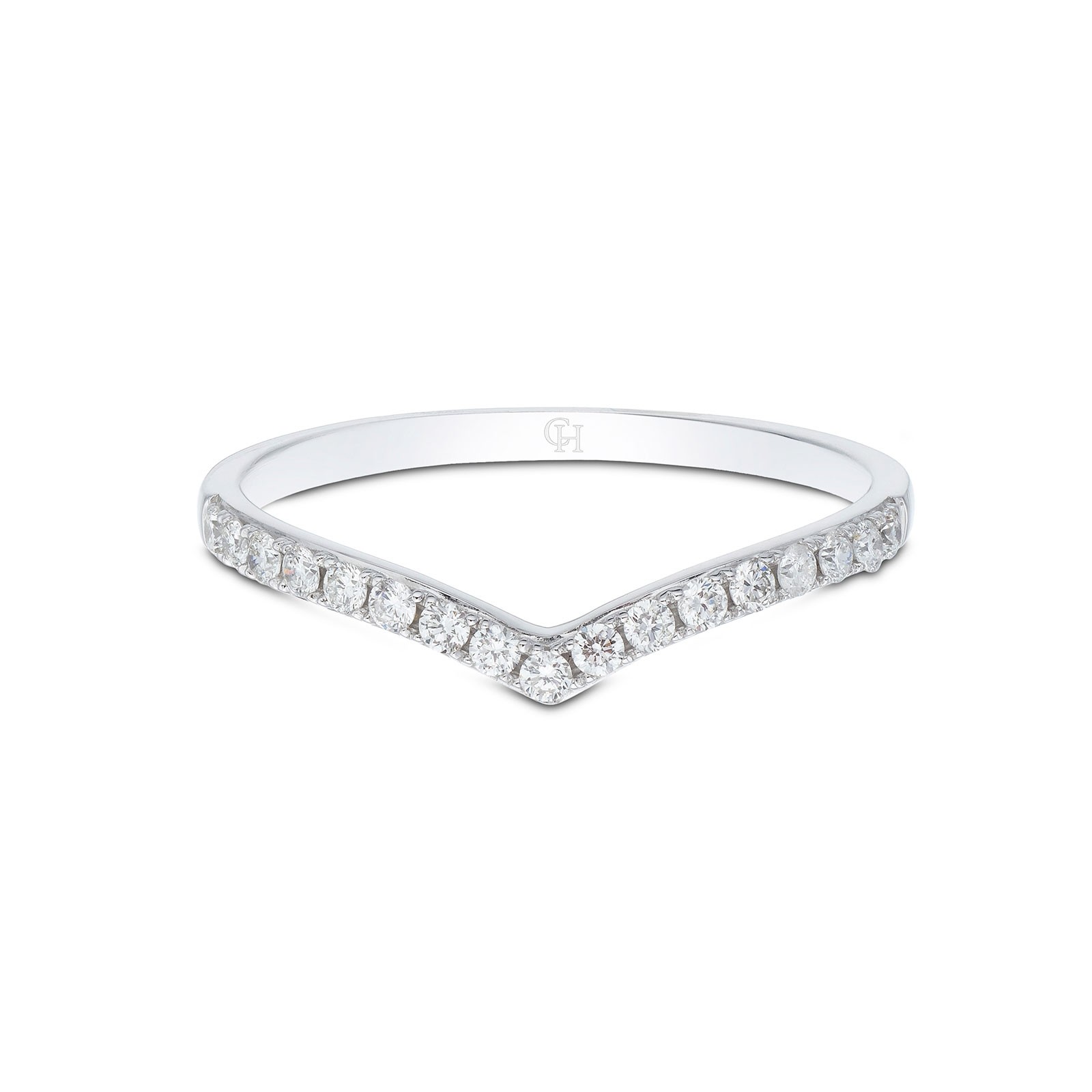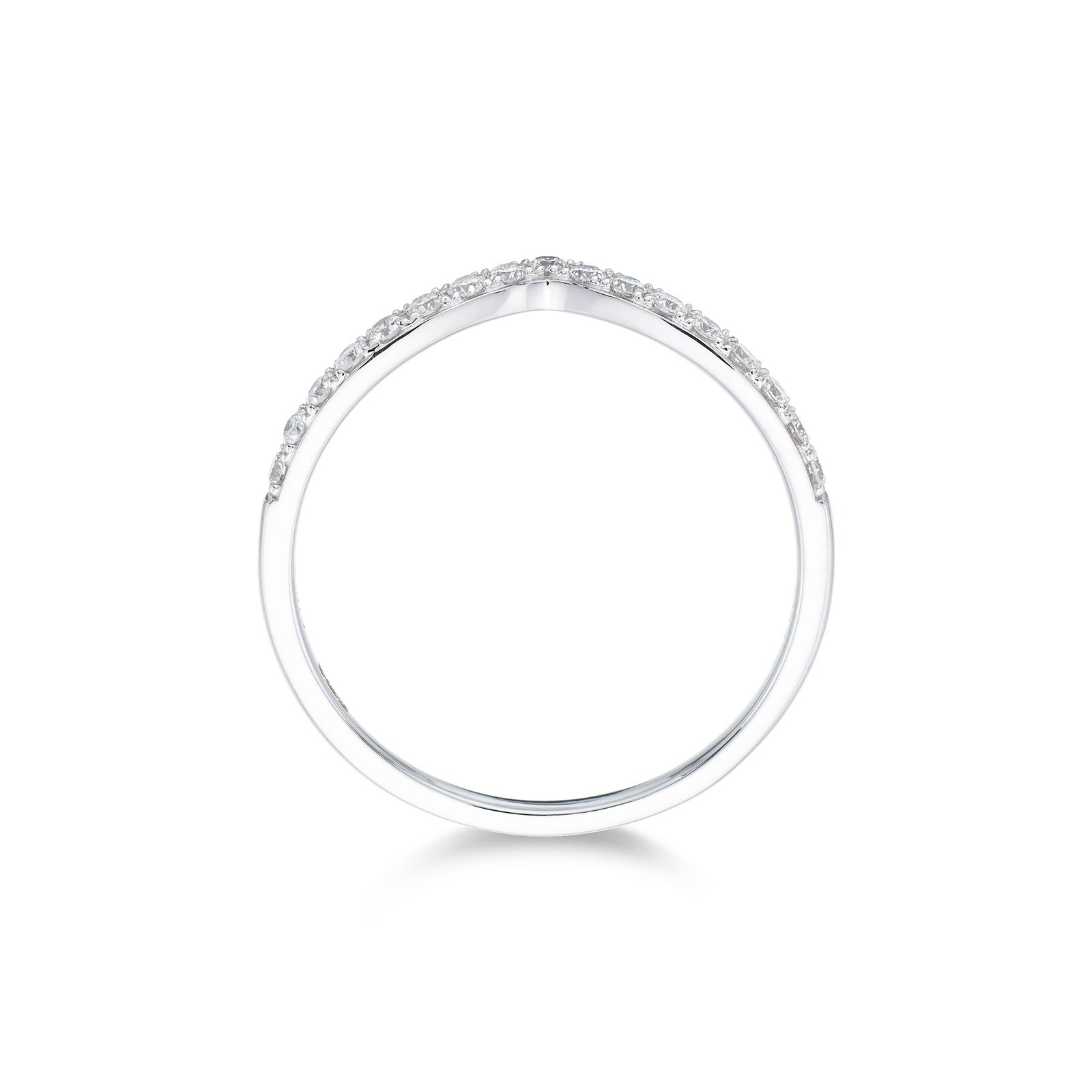 Showcase your love and commitment with this dreamy wishbone designed 9ct white gold diamond ring. With a slight v shape design, this sparkling diamond ring made up of a row of round brilliant cut diamonds, makes a statement while complimenting your existing engagement ring beautifully. A total diamond carat weight of 0.20, means this is a sparkling ring will melt your heart every time you see it. Diamond Information: Cut- Round Brilliant, Colour - G-H, Clarity - I1, Carat Weight - 0.20ct.