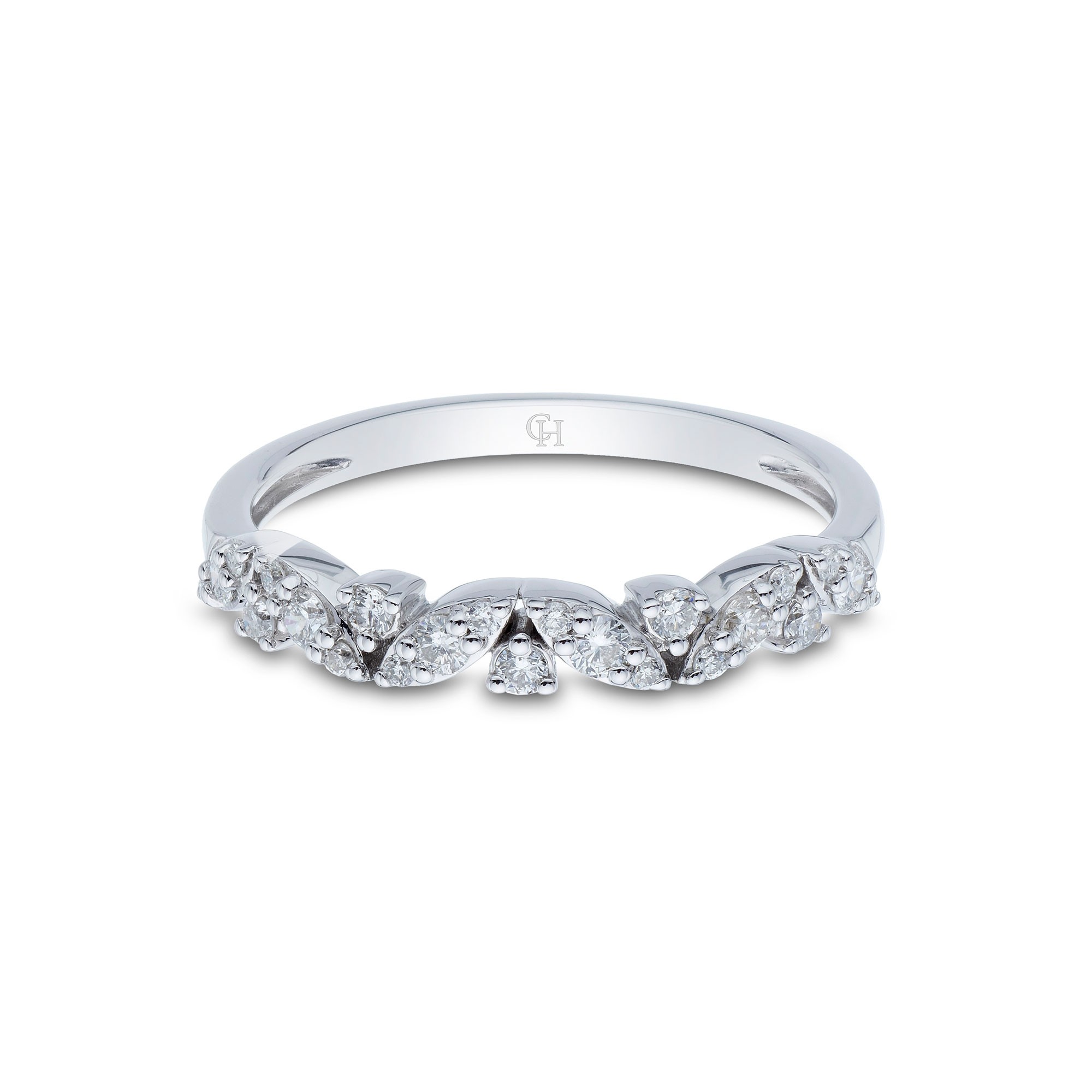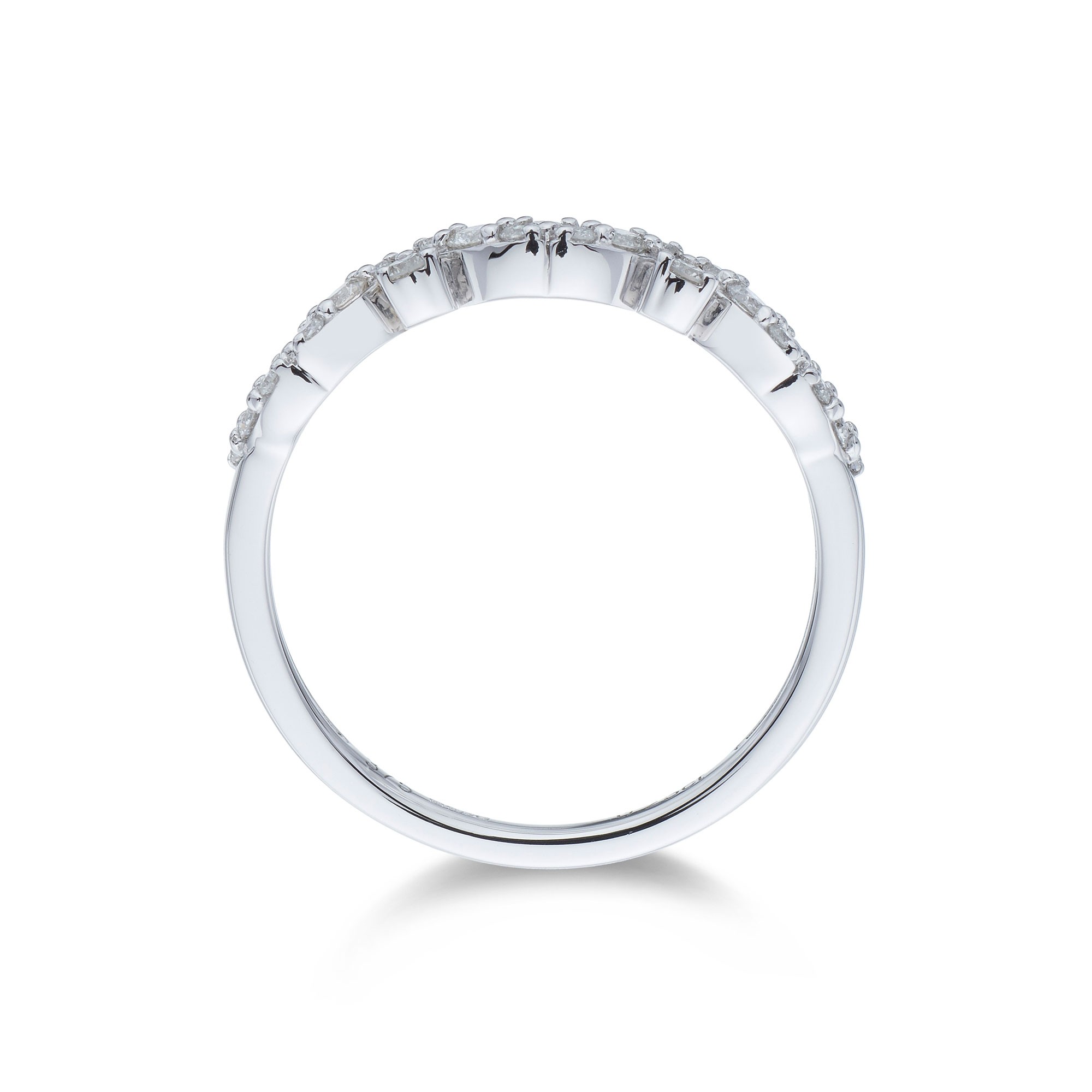 A perfect gift to mark an anniversary or milestone for your loved one or simply to show your etnernal love, this 9ct white gold diamond leaf style, eternity ring is an exquisitely crafted design. This unique, striking, elegant and sophisticated ring boasts dazzling 0.25ct brilliant cut diamondswhich complete this ring and would compliment existing jewels and engagement or wedding bands beautifully. Diamond Information: Cut- Round Brilliant, Colour - G-H, Clarity - SI1, Carat Weight - 0.25ct.