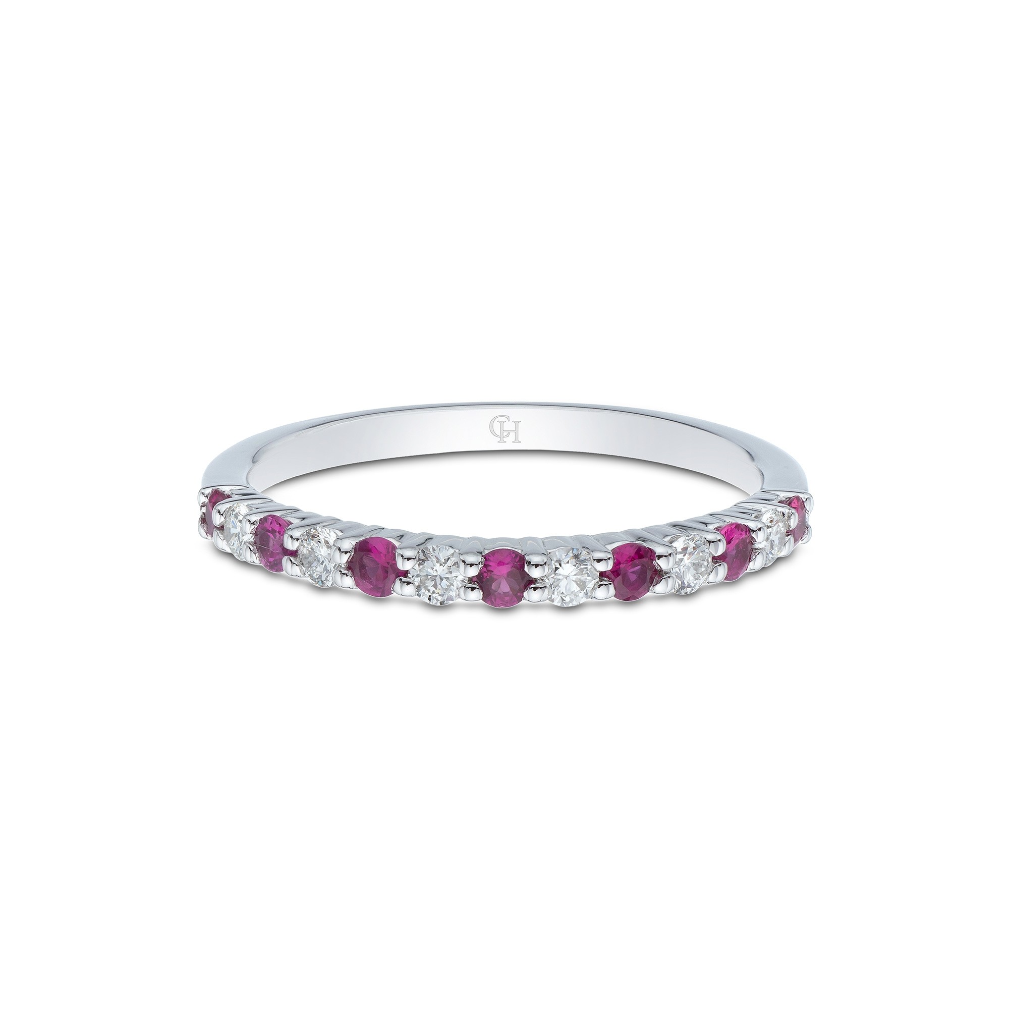 A truly romantic design, this 9ct white gold ruby and diamond eternity ring is a wonderful way to show a loved one your eternal love. Symbolising eternal love and romance with its regal round brilliant cut rubies weighing 0.21ct and its glittering round brilliant cut diamonds with a combined weight of 0.20ct, this ring is the perfect gesture to show that you care. Presented in a claw setting, this piece is sparkling with vintage glamour. Diamond Information: Cut- Round Brilliant, Carat- 0.41ct.