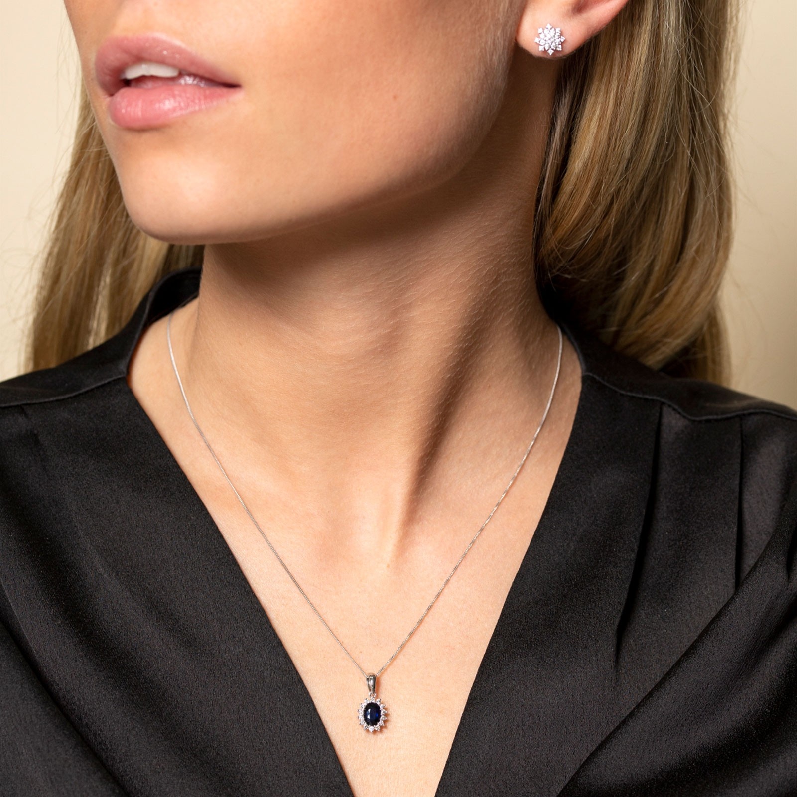 Enhance your evening look with this 9ct white gold diamond 0.18ct and sapphire halo pendant from Chisholm Hunter. The deep blue oval sapphire is enhanced by the vintage-inspired diamond halo surrounding it and illuminating the white gold setting. The 7x5mm pendant dangles gracefully from a 16-inch chain and can be styled with the matching earrings.