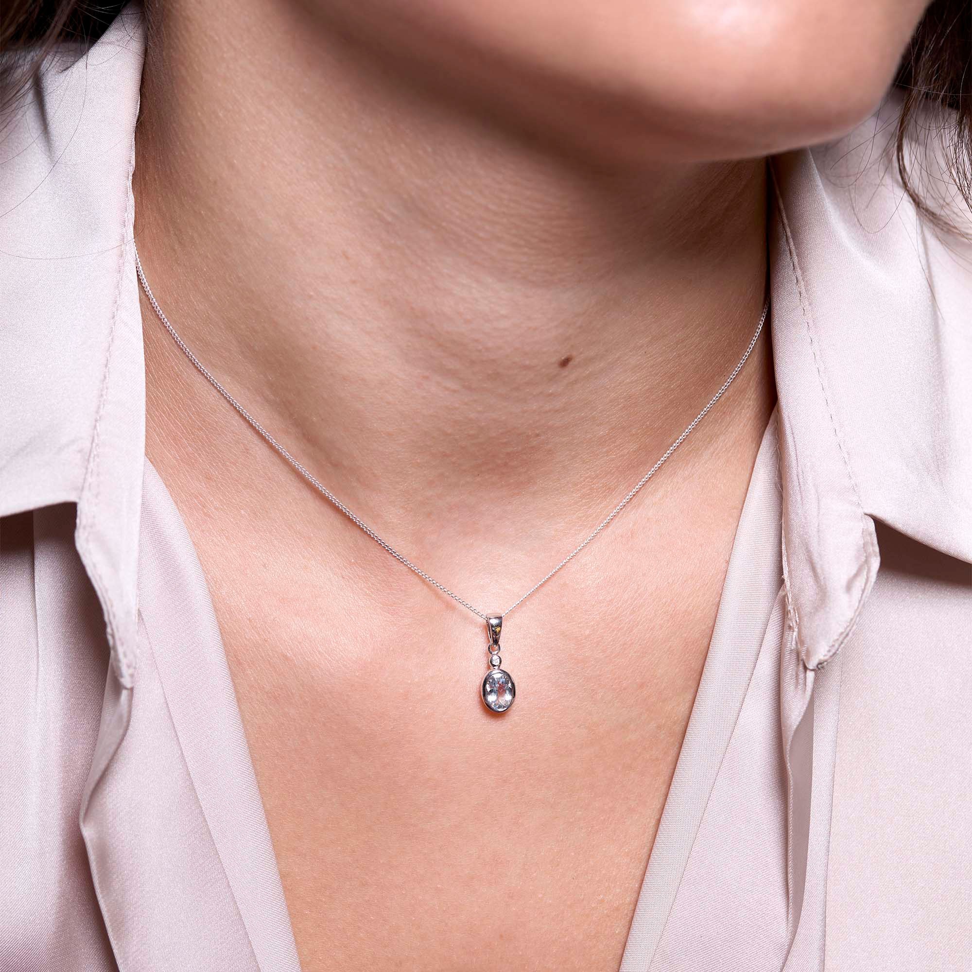 Crafted from the finest 9ct white gold, this pendant boasts a radiant 0.85ct oval-cut aquamarine - a gemstone celebrated for its breathtakingly beautiful blue hues which symbolise tranquillity and eternal youth. This magnificent aquamarine is complemented by the subtlety of a sparkling diamond, meticulously placed to enhance the pendant's allure and ensure that it catches the light and the attention in any room.