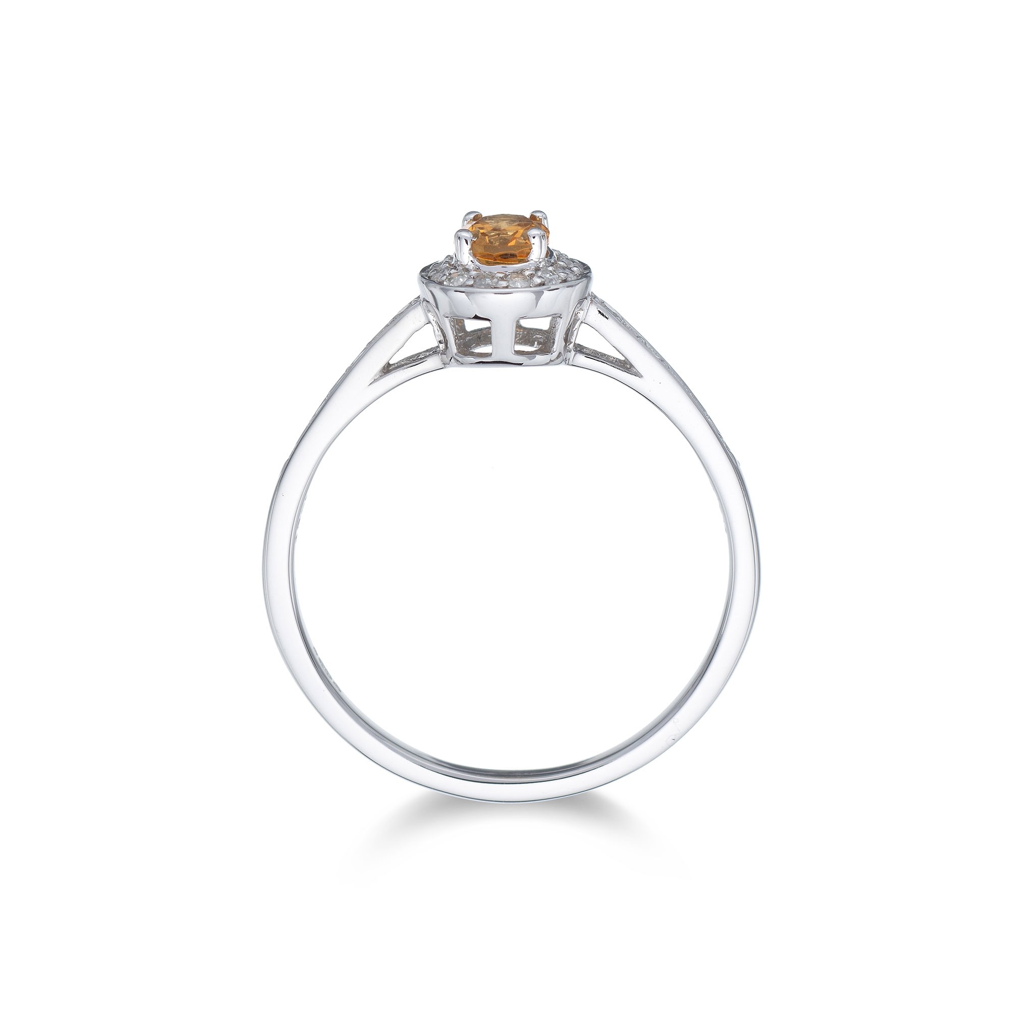 A traditional and classic design shines through in this citrine and diamond solitaire ring. The star of the design is the 0.40ct oval cut citrine, held in a subtle 4 claw setting. It is framed with a halo of round brilliant diamonds, their cut perfectly designed to reflect the most light and to sparkle from every direction. The round brilliant diamond decoration continues down the shoulders of the 9ct white gold band, which also gives a contemporary feel to the design. Diamond information; Cut - Oval/Round Brilliant, Carat Weight - 0.53ct