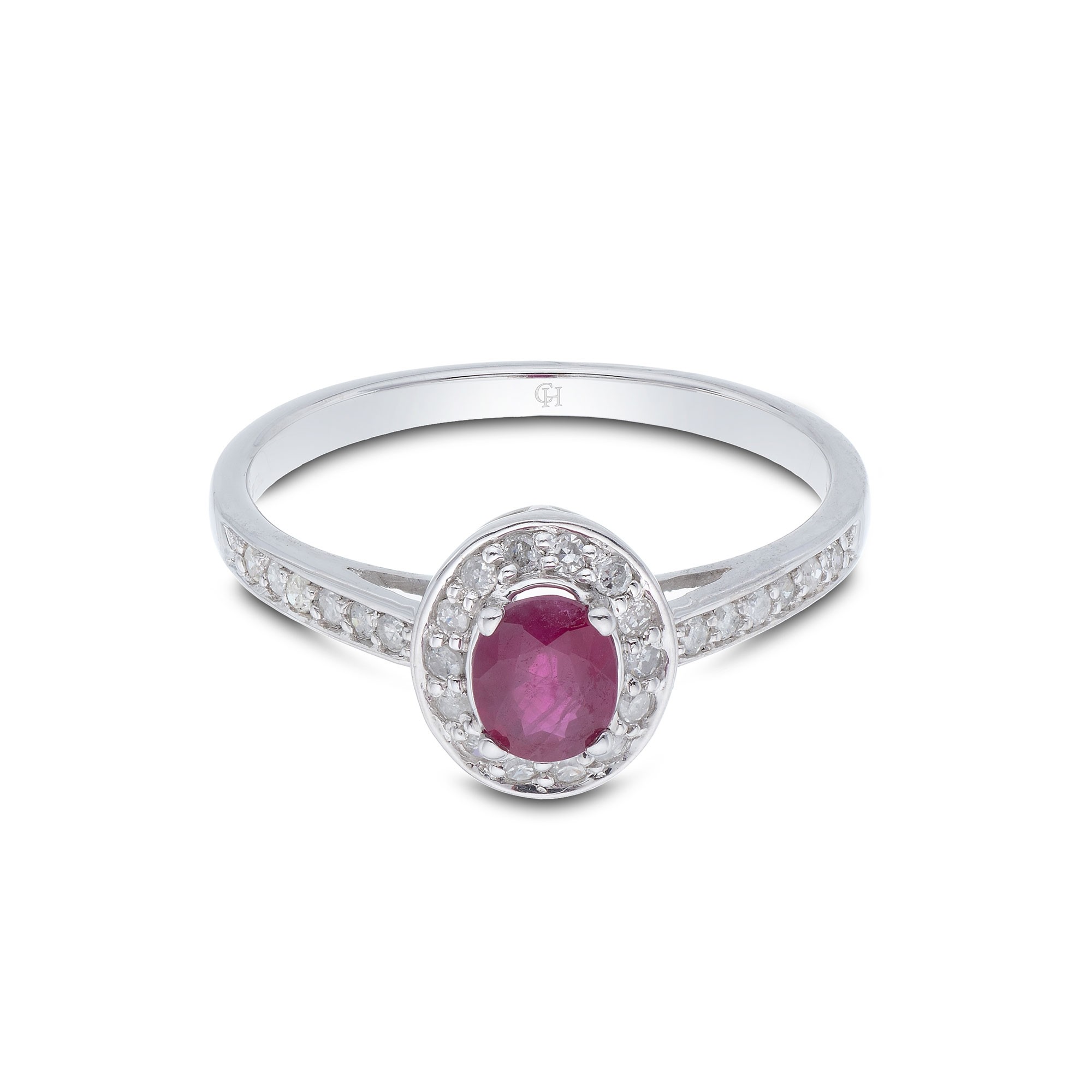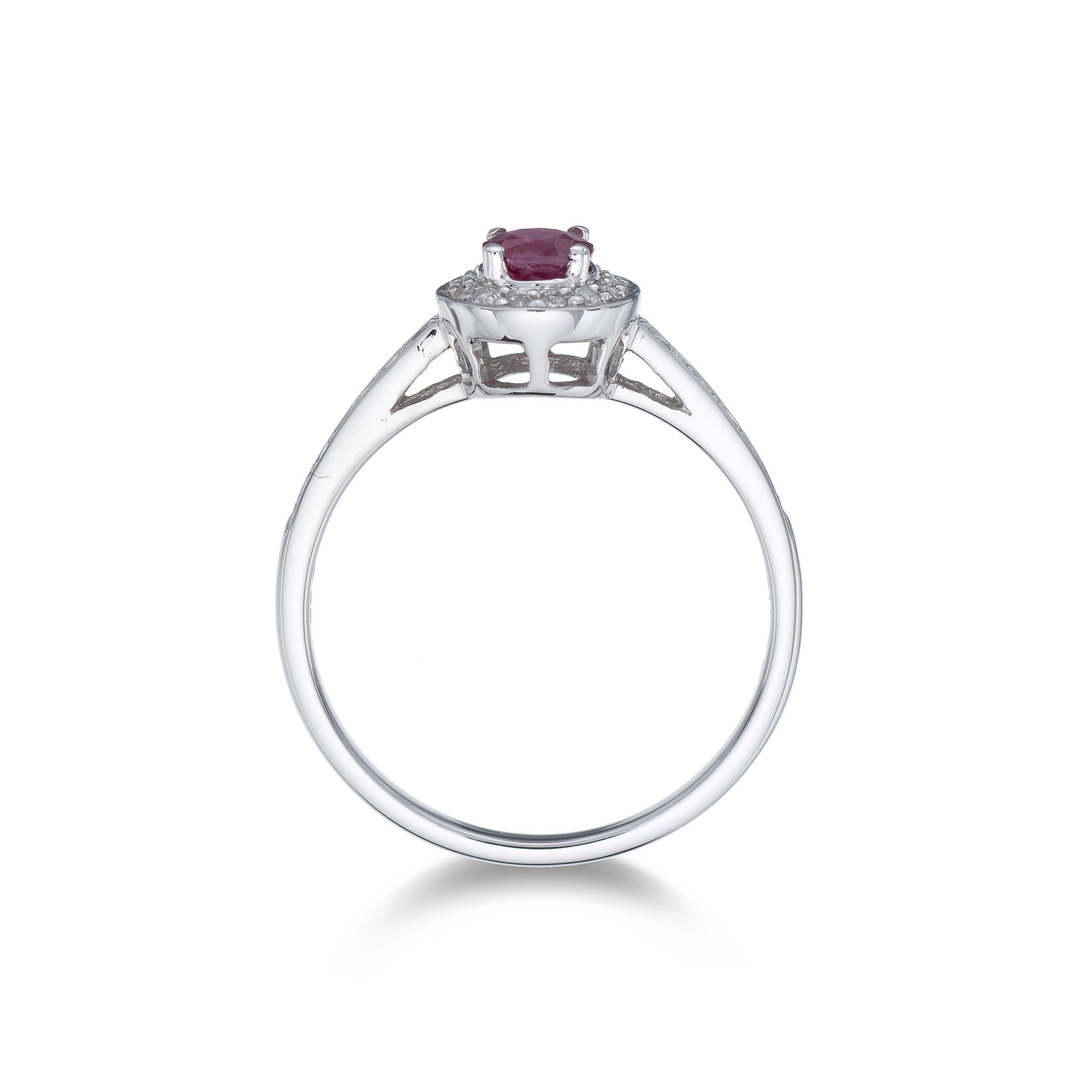 A stunning 0.40ct oval cut ruby is the star of the show in this elegant 9ct white gold halo diamond ring. The striking deep red of the 0.40ct oval cut ruby is beautifully accentuated by the sparkling 0.13ct diamond halo and shoulders. The perfect choice for those seeking a classic yet eye-catching design that is sure to be become a treasured addition to any jewellery collection.