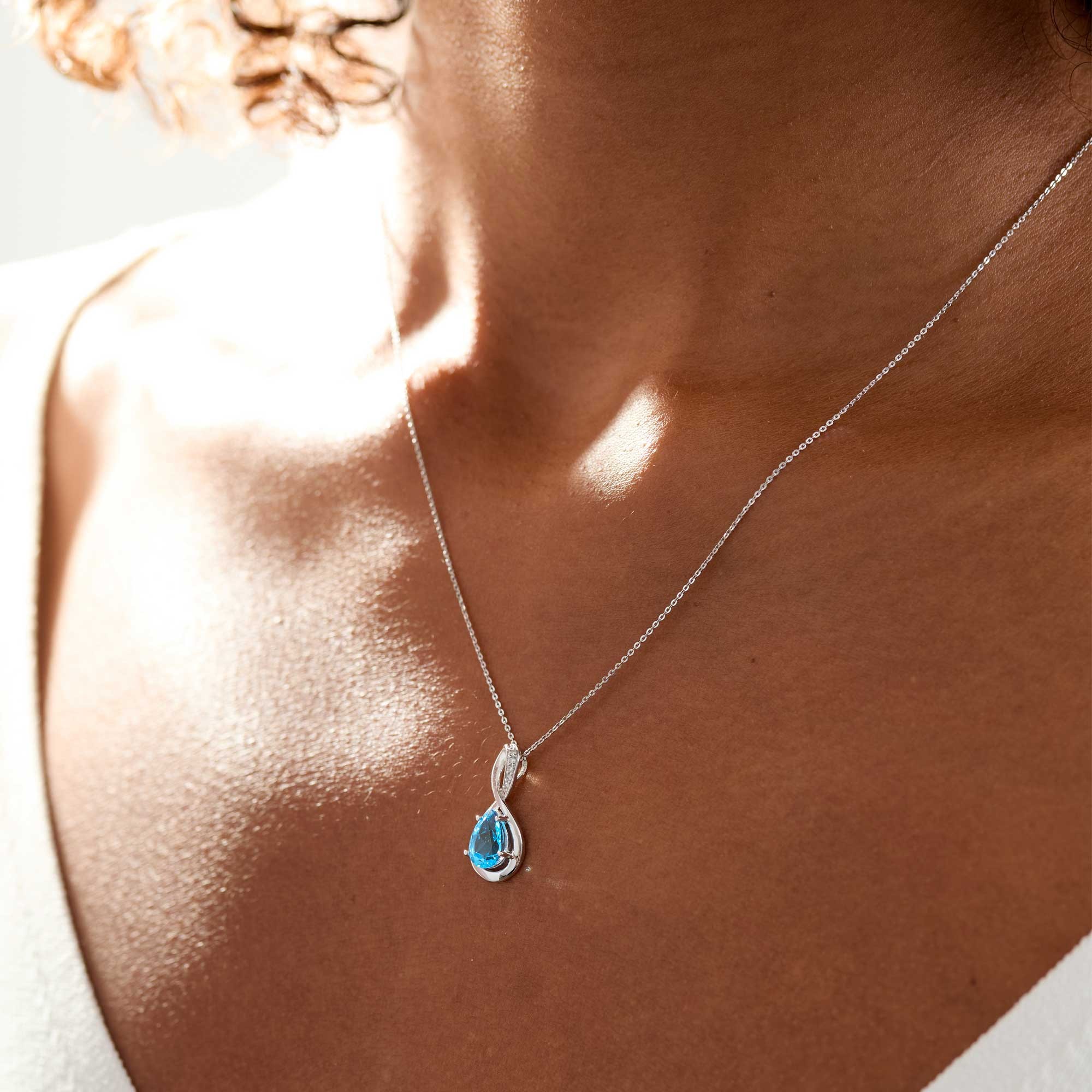 The 9ct White Gold Pear Shape 1.40ct Blue Topaz Infinity Pendant from Chisholm Hunter is a stunning piece designed for her. Crafted in luxurious white gold, this pendant showcases a captivating pear-cut blue topaz, weighing 1.40ct, which radiates elegance and charm.