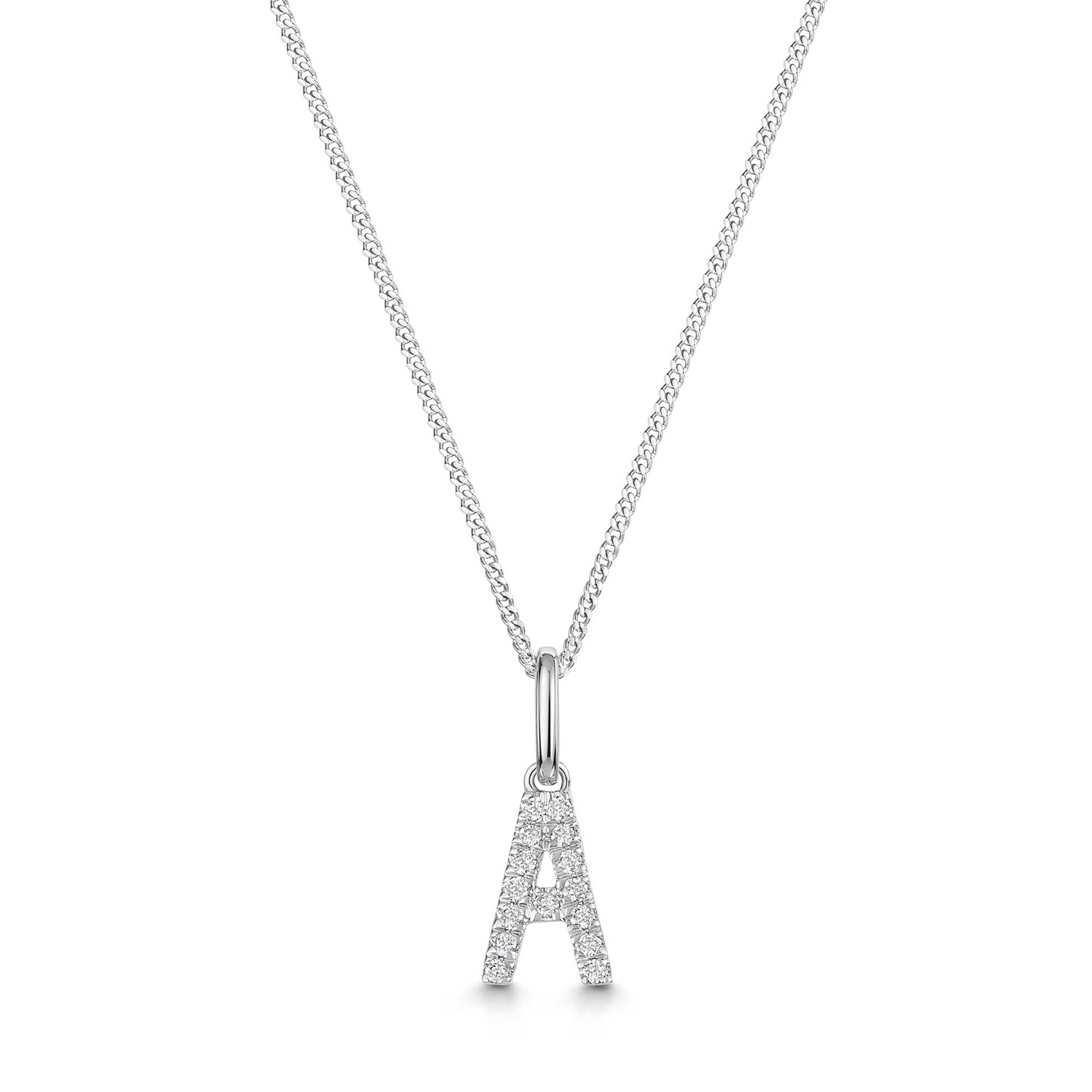 This 9ct White Gold Round Brilliant 0.06ct Diamond Letter A Pendant from Chisholm Hunter brings personal style and refined simplicity together. Crafted in 9ct white gold, the crisp Initial A showcases a bright, modern finish.