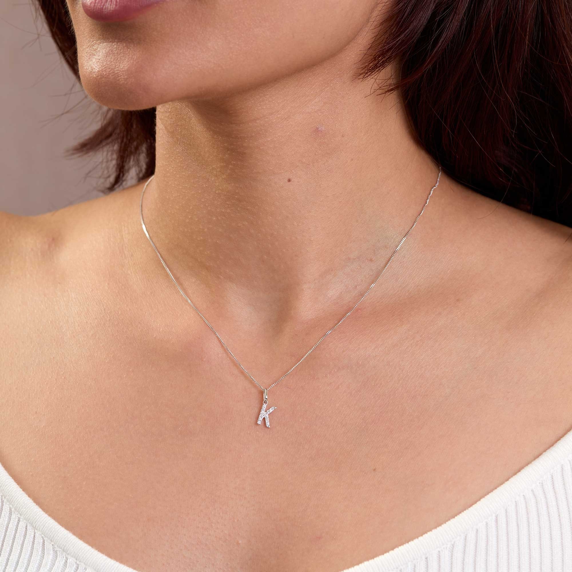Crafted in 9ct white gold, the Initial K sits in a clean, modern silhouette. A total weight of 0.06ct round brilliant diamonds adds subtle sparkle. The diamonds are graded I colour and I1 clarity, offering attractive fire. The round brilliant cut maximises light return for a bright, confident look.