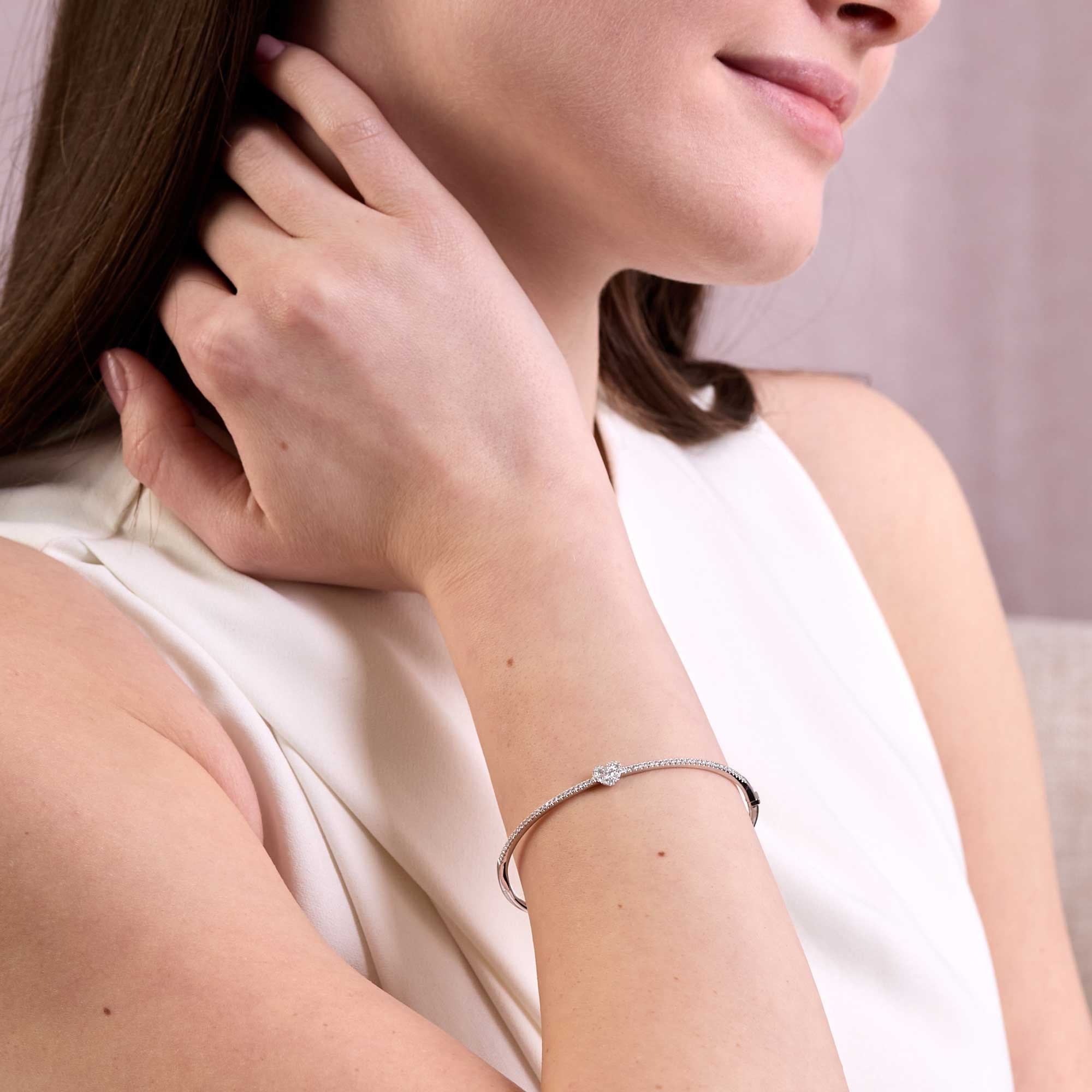 This diamond bangle works with occasion wear and everyday outfits alike. Its slim profile layers easily with other bracelets, yet holds its own as a single statement. White gold offers lasting lustre and pairs well with both cool and warm tones.