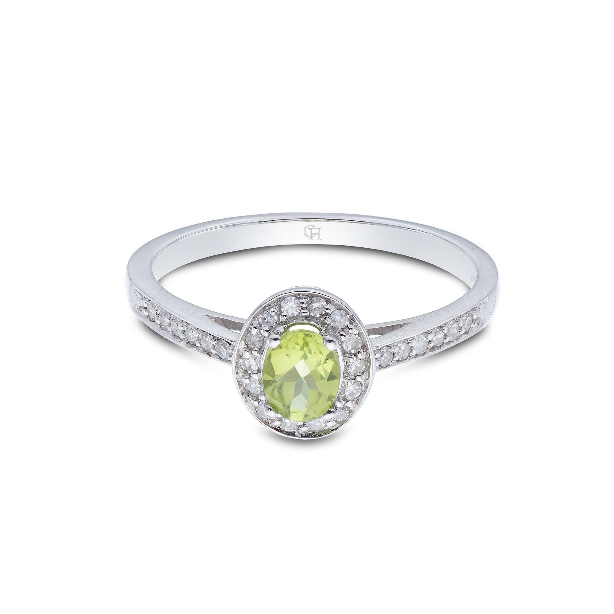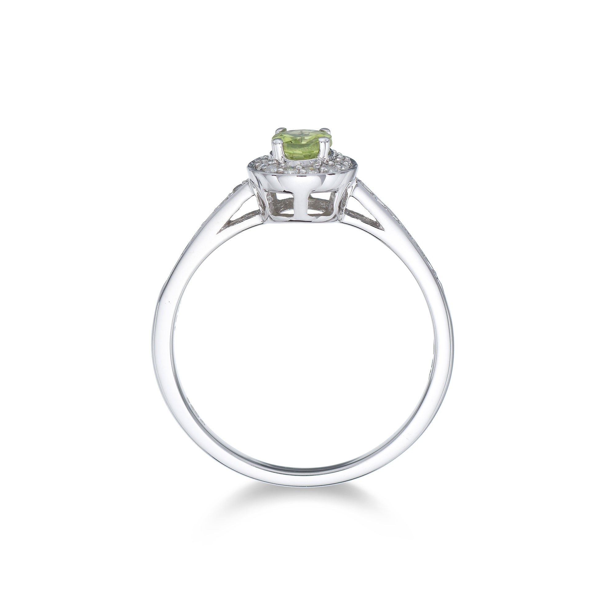 A traditional and classic design shines through in this peridot and diamond solitaire ring. The star of the design is the 0.40ct oval cut peridot, held in a subtle 4 claw setting. It is framed with a halo of round brilliant diamonds, their cut perfectly designed to reflect the most light and to sparkle from every direction. The round brilliant diamond decoration continues down the shoulders of the 9ct white gold band, which also gives a contemporary feel to the design. Diamond information; Cut - Oval/Round Brilliant, Carat Weight - 0.53ct