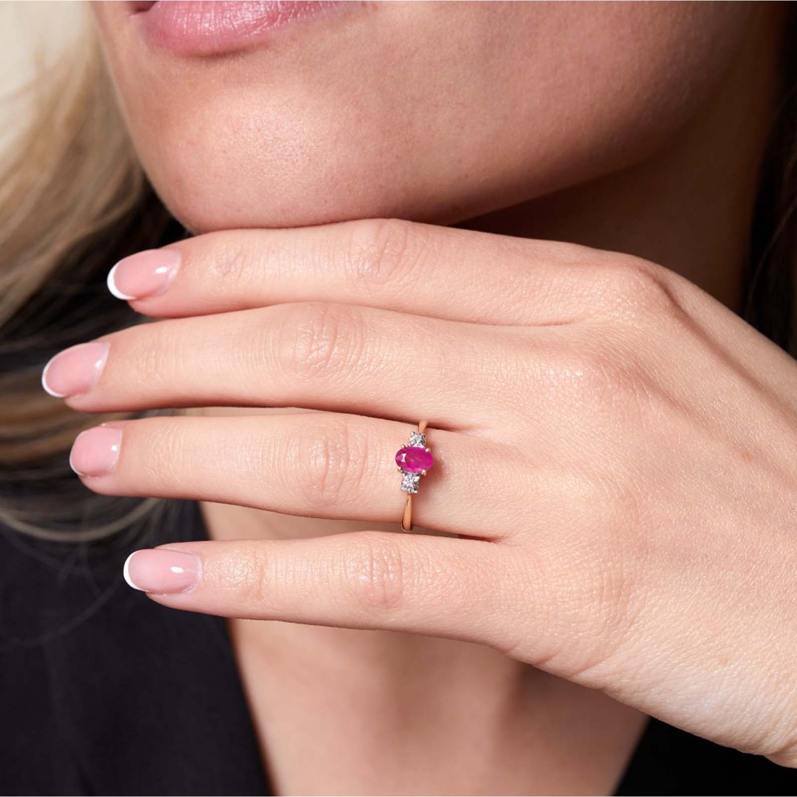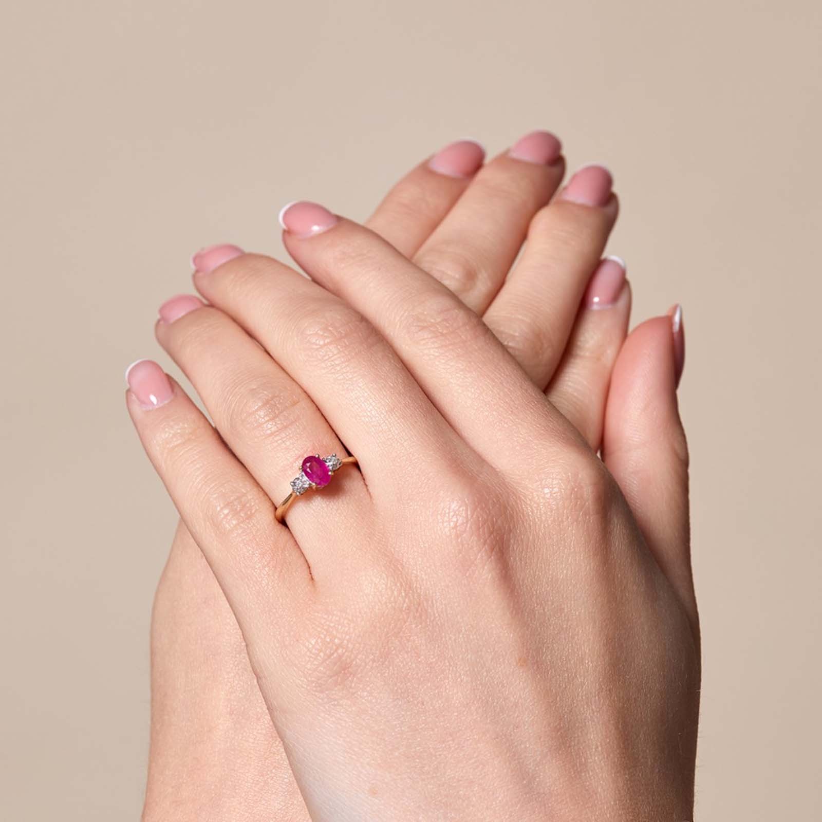 Presenting the stunning 9ct yellow gold 0.50ct oval ruby and diamond three stone ring, a captivating blend of timeless elegance and fiery brilliance. This exquisite ring showcases a majestic oval-cut ruby at its centre, radiating a rich and passionate red hue. The ruby, weighing 0.50 carats, exudes a regal charm and captures the essence of love and vitality. 2 x illusion set diamonds sparkle beautifully on either side to complement the vibrant ruby, creating a mesmerising trio of stones.
